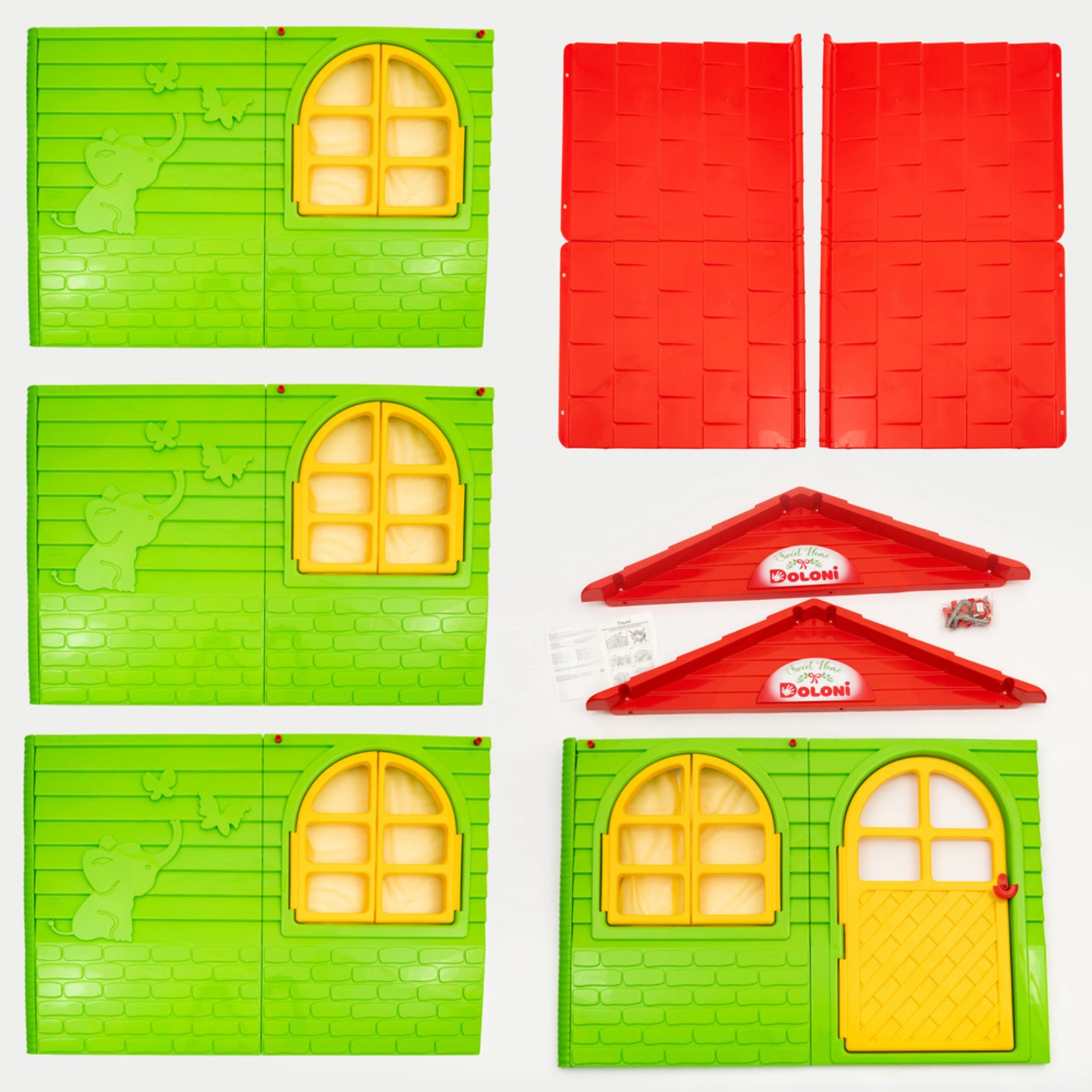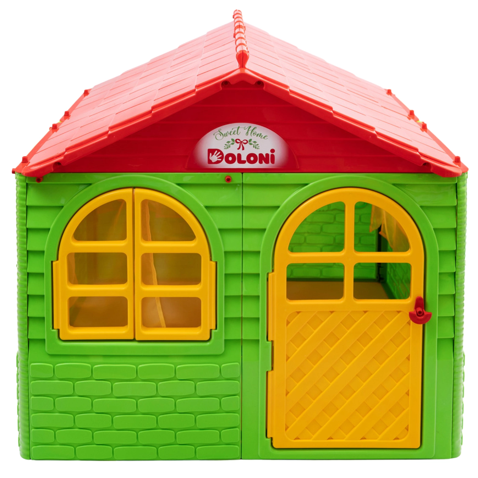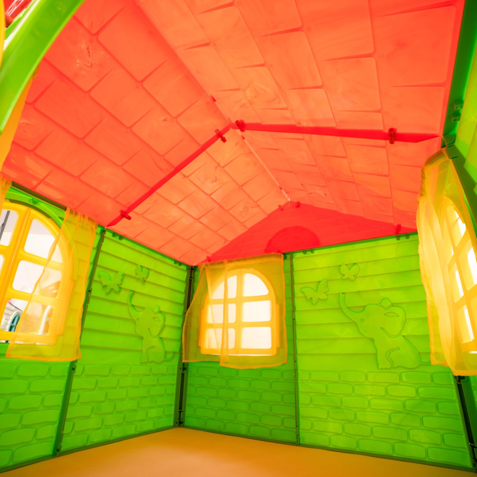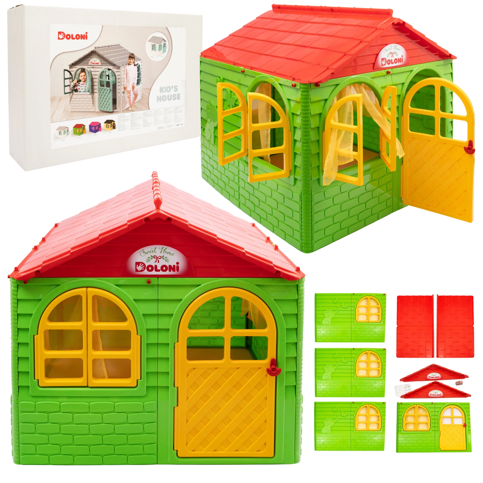 Domek posiada cztery okna z otwieranymi okiennicami oraz zasłonami, które umożliwiają regulację światła i wentylację. Dodatkowo, wyposażony jest w otwierane drzwi wejściowe, które zapewniają łatwy dostęp do wnętrza. To idealne miejsce do zabawy i spędzania czasu na świeżym powietrzu lub w przytulnym wnętrzu domu.