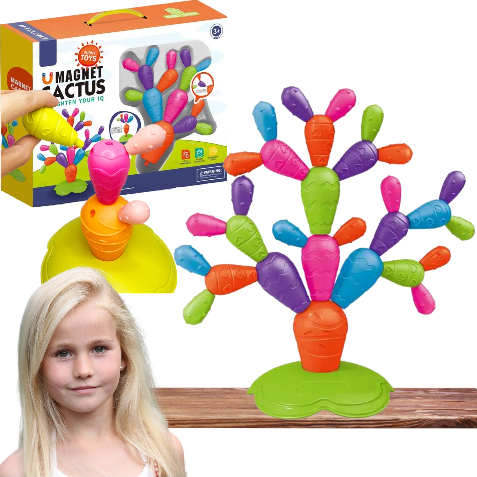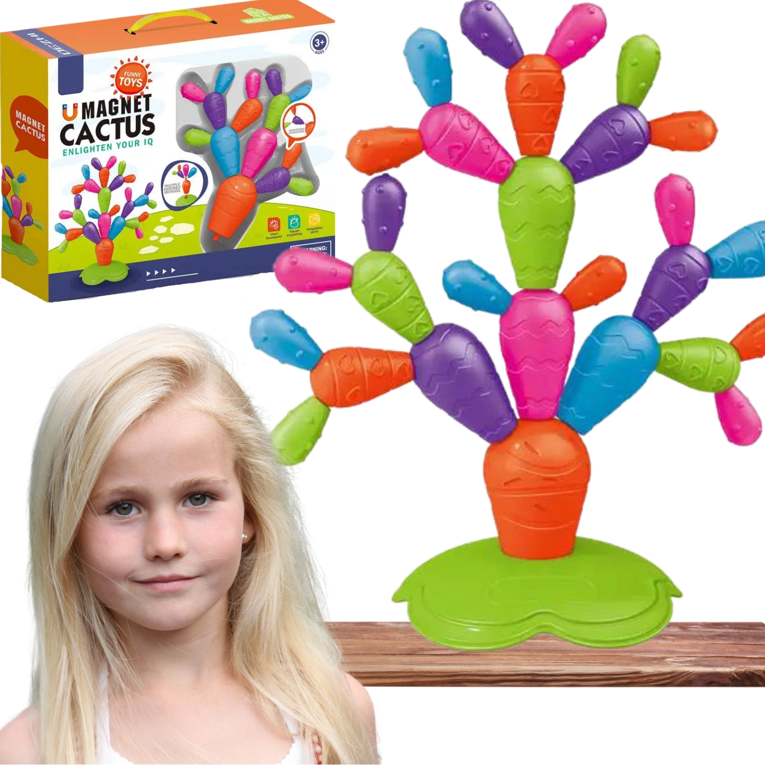 Zestaw składa się z kolorowych klocków, które po ułożeniu tworzą wieżę przypominającą kaktusa.