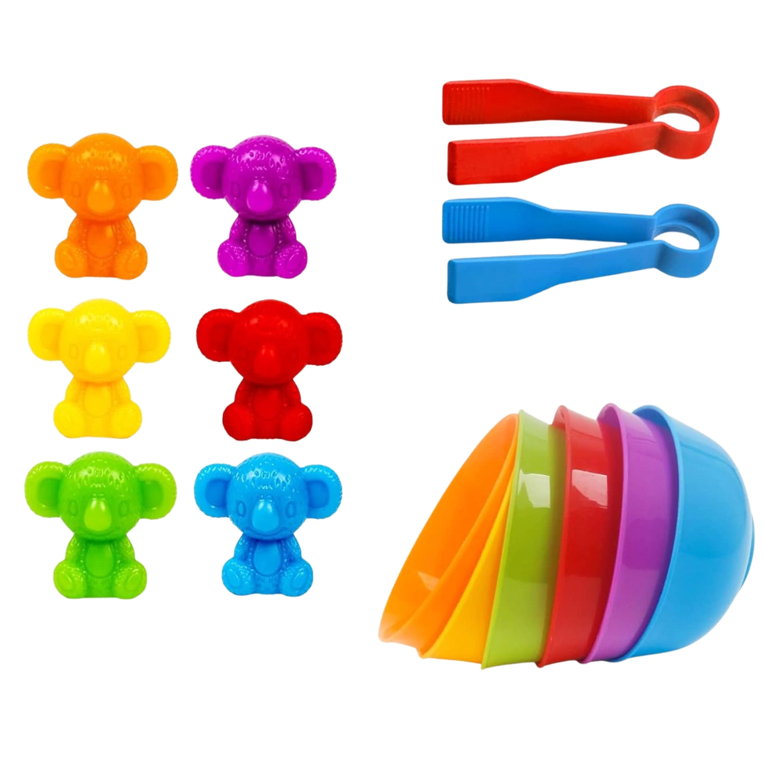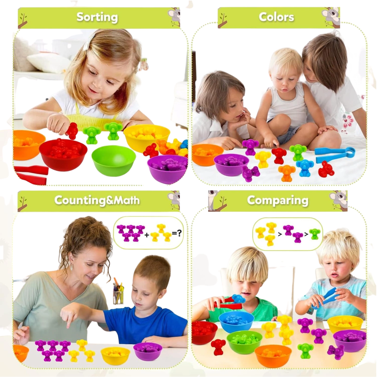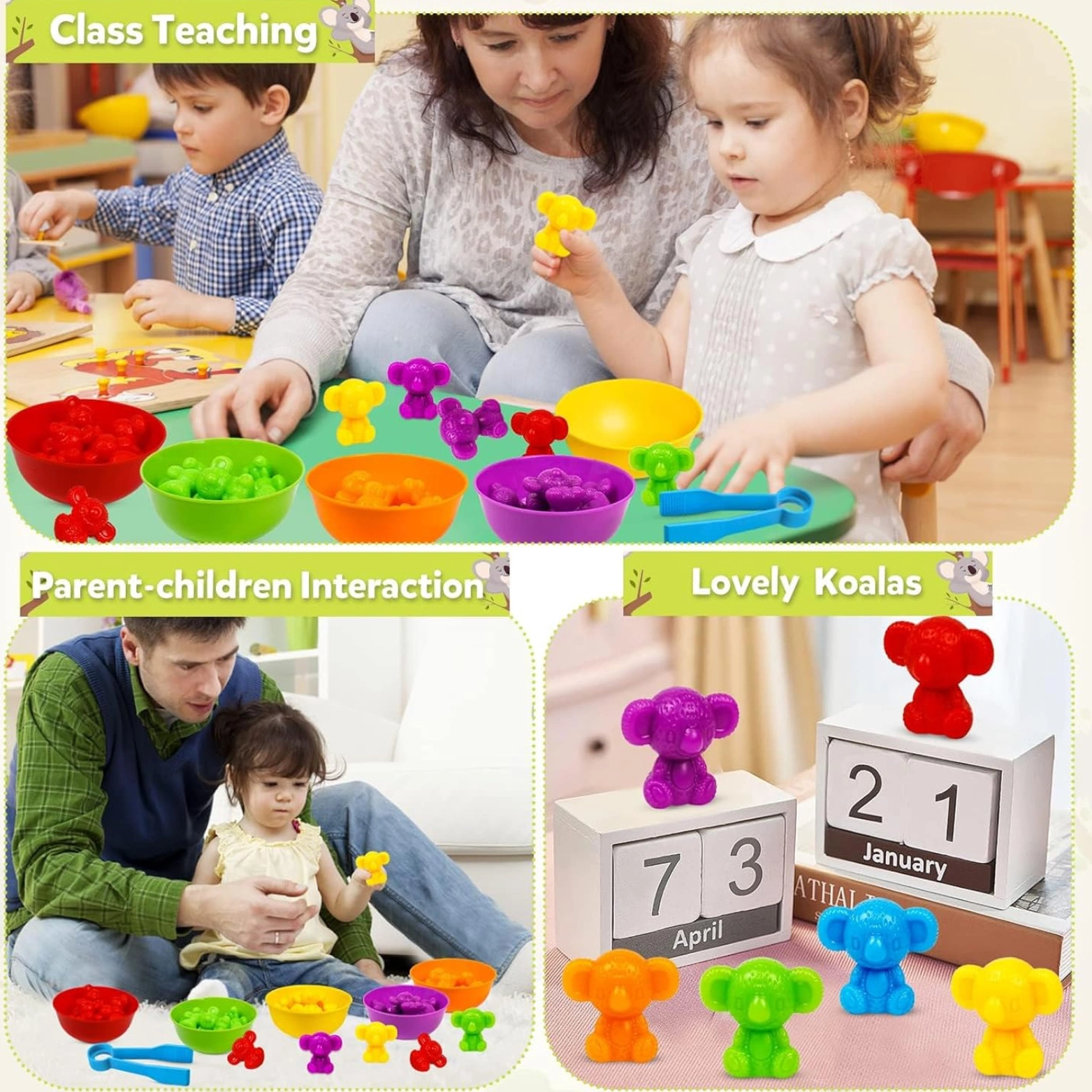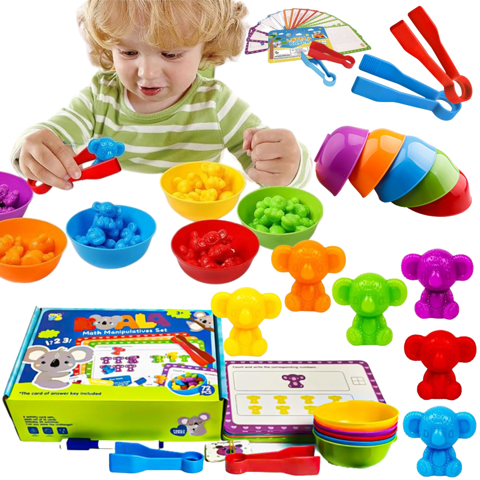 Zestaw zawiera figurki koali, które można sortować według liczby lub innego kryterium, rozwijając zdolności matematyczne i logiczne myślenie. Kolorowe miseczki oraz różnorodność figurek zachęcają dzieci do rozpoznawania i porównywania kolorów.