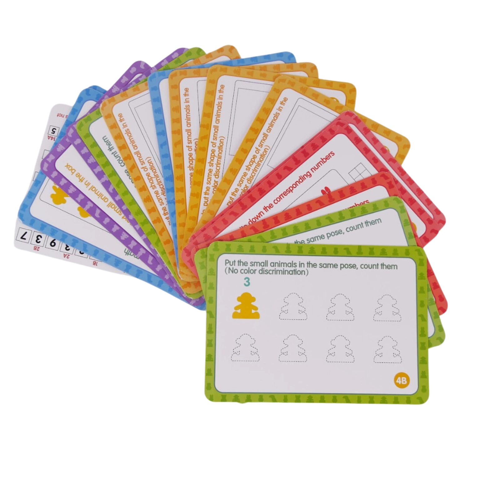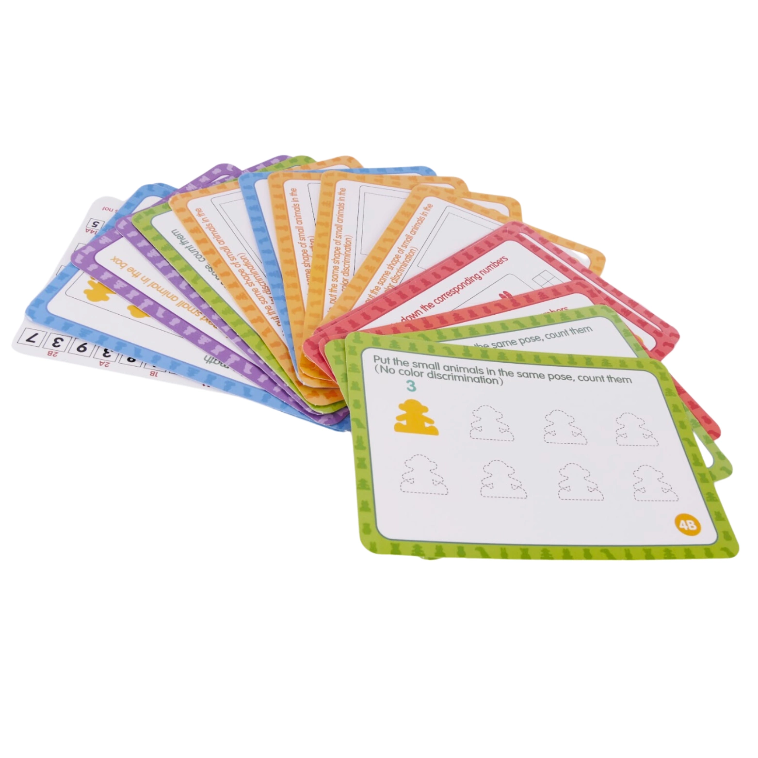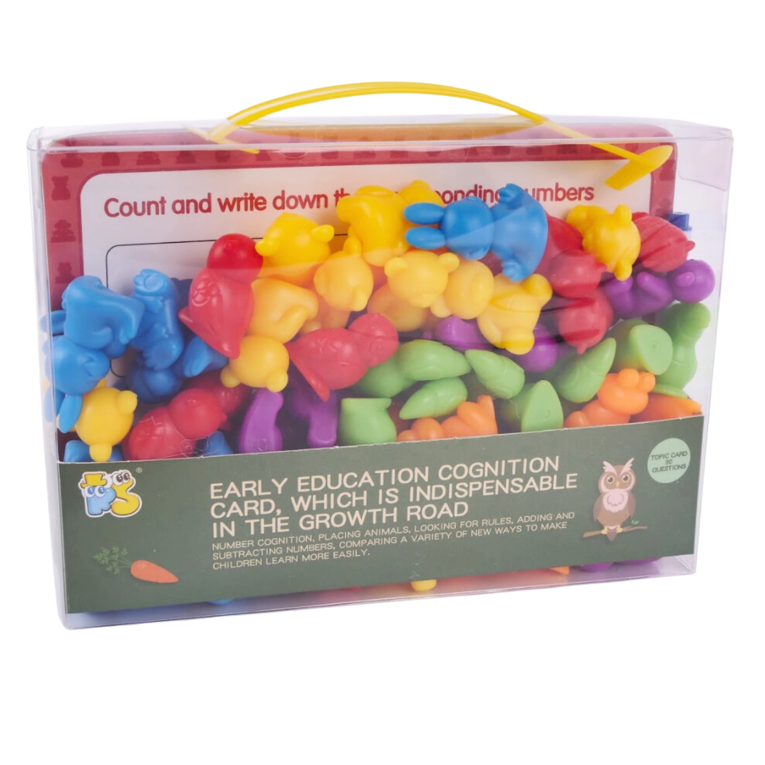 Zestaw zawiera elementy do sortowania według różnych kategorii, co rozwija zdolności logicznego myślenia i organizacji. Karty z pytaniami pozwalają na naukę liczenia, rozwijając zdolności matematyczne.