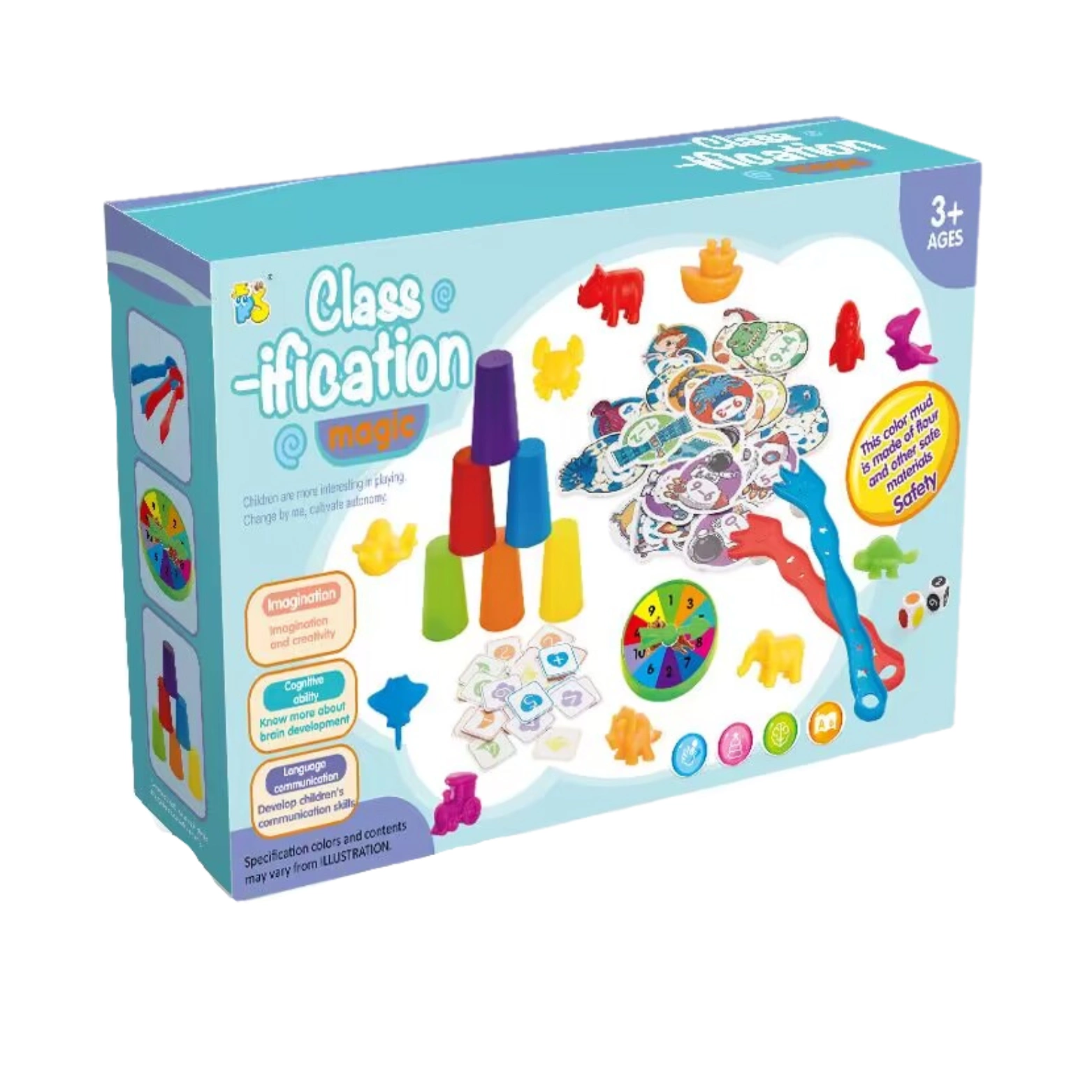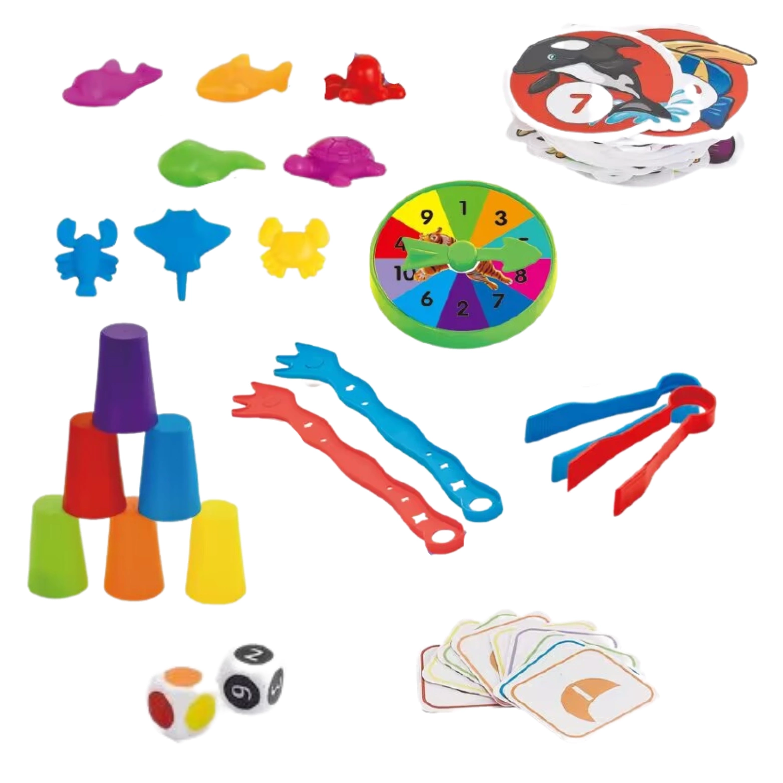 W zestawie znajduje się 6 kolorowych kubeczków, które reprezentują różne kolory zwierzątek morskich, a także 2 pary szczypców, które umożliwiają przenoszenie zwierzątek do odpowiednich kubeczków według ich koloru. Dzięki temu dziecko może ćwiczyć swoje umiejętności motoryczne i koordynację ręka-oko, jednocześnie ucząc się rozpoznawania kolorów i dopasowywania ich.