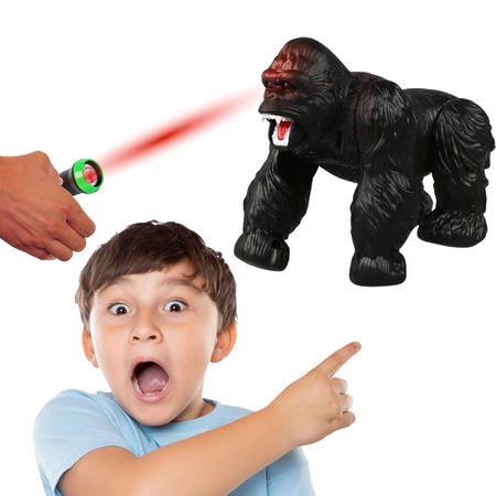 Zwróć uwagę na kształt pilota – jest to latarka z funkcją włączania podświetlenia i regulacji ruchów zabawki. Wyślij goryla do ciemnego pokoju, a następnie łatwo go dostrzeż jasnym reflektorem.