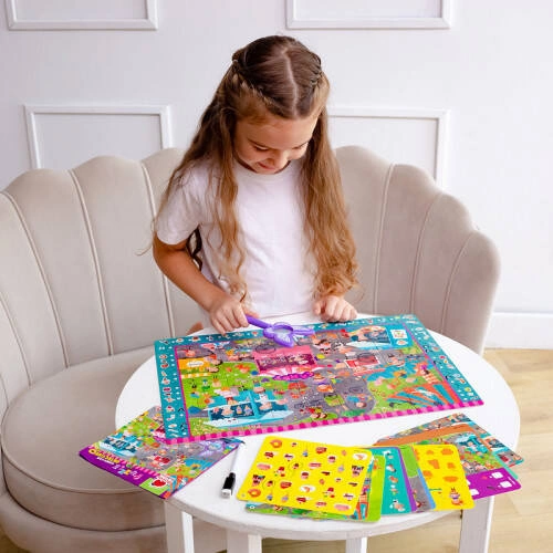 Gra dostarcza również karty z zadaniami pisz-i-zmazuj, które stanowią dodatkowe wyzwanie i rozwijają umiejętności logicznego myślenia. Gracze starają się udzielić poprawnych odpowiedzi i zaznaczyć je na kartach, korzystając z załączonego markera z gąbeczką. Po skończeniu zabawy, odpowiedzi można łatwo zetrzeć, aby zacząć zabawę od nowa.