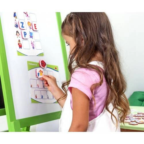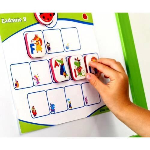 Zadania na kartach, znajdujących się w zestawie pomagają w nauce liter i słówek, jak i rozwijają umiejętności logicznego myślenia i skupienia uwagi.