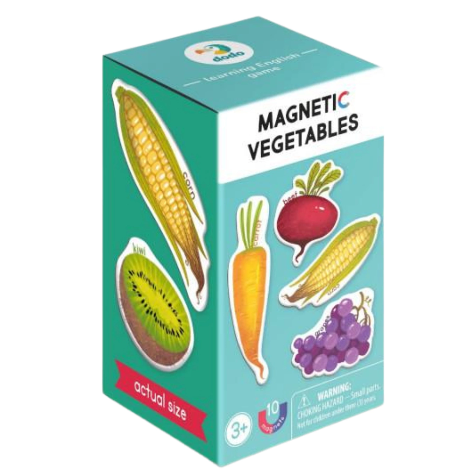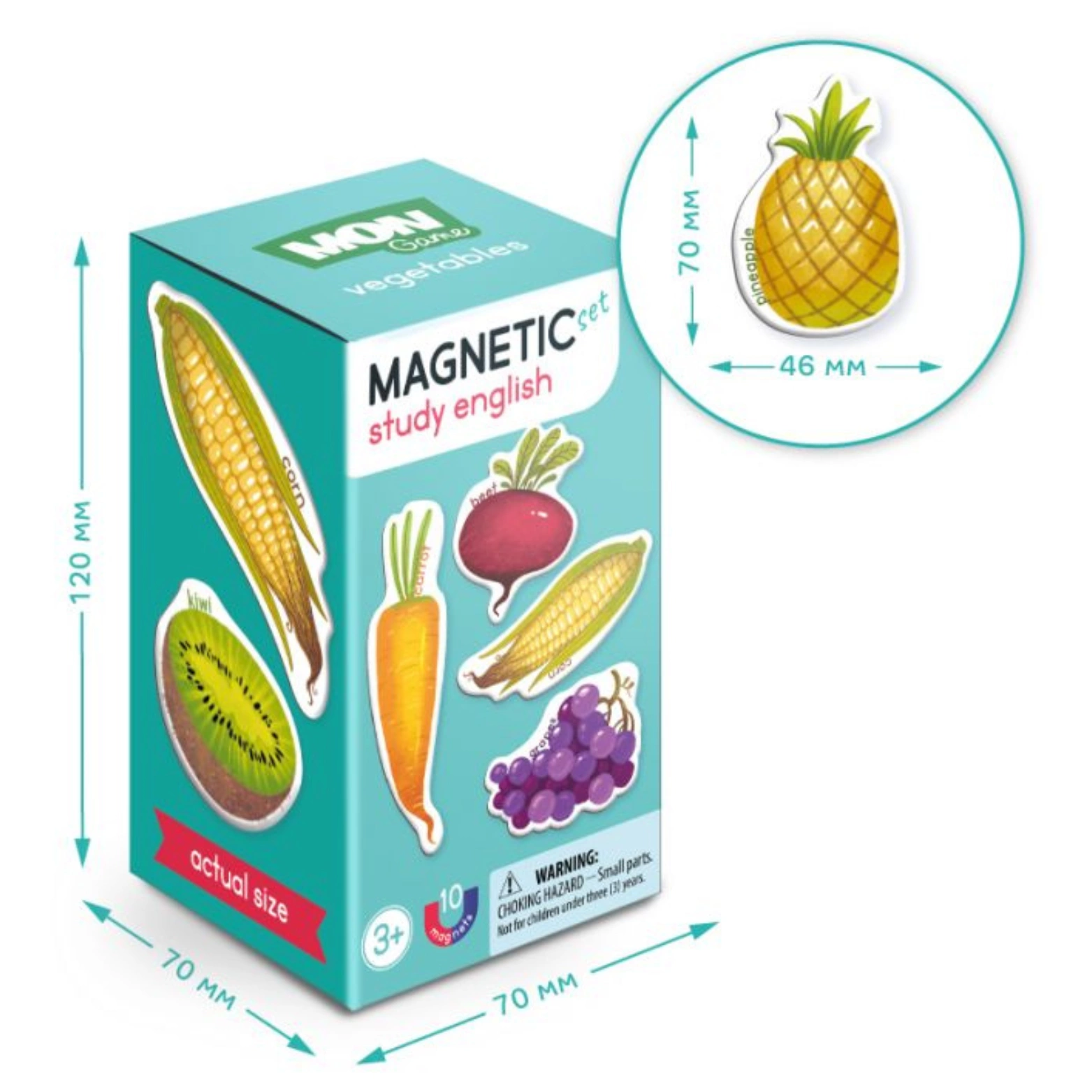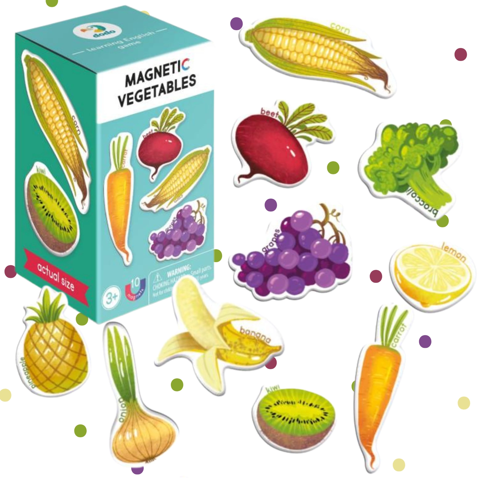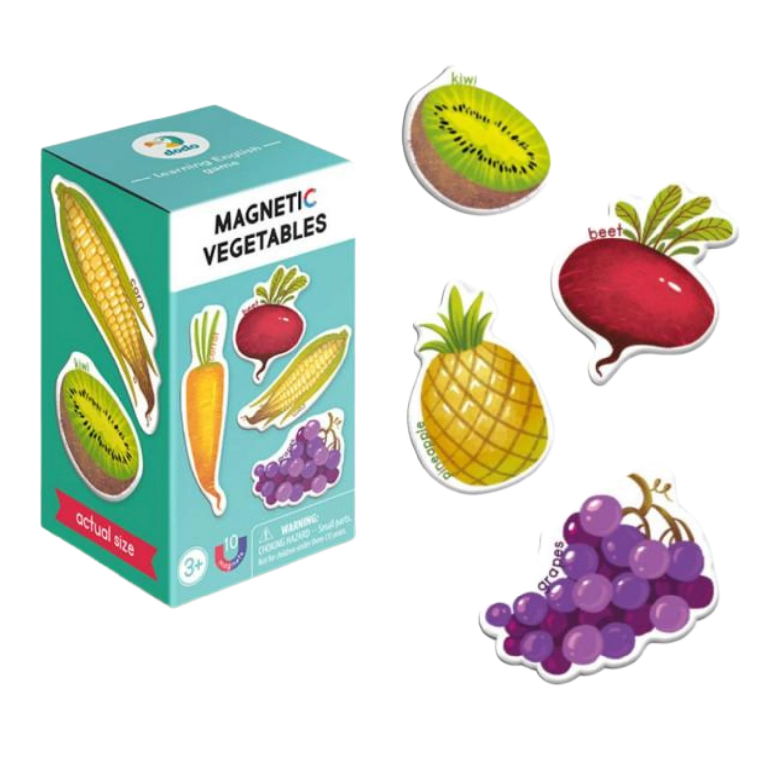 Każdy magnes posiada napis z nazwą danego owocu lub warzywa, napisaną w języku angielskim! To nie tylko kolorowa zabawa, ale także doskonały sposób na naukę angielskiego poprzez rozrywkę dla dzieci powyżej 3 roku życia.
