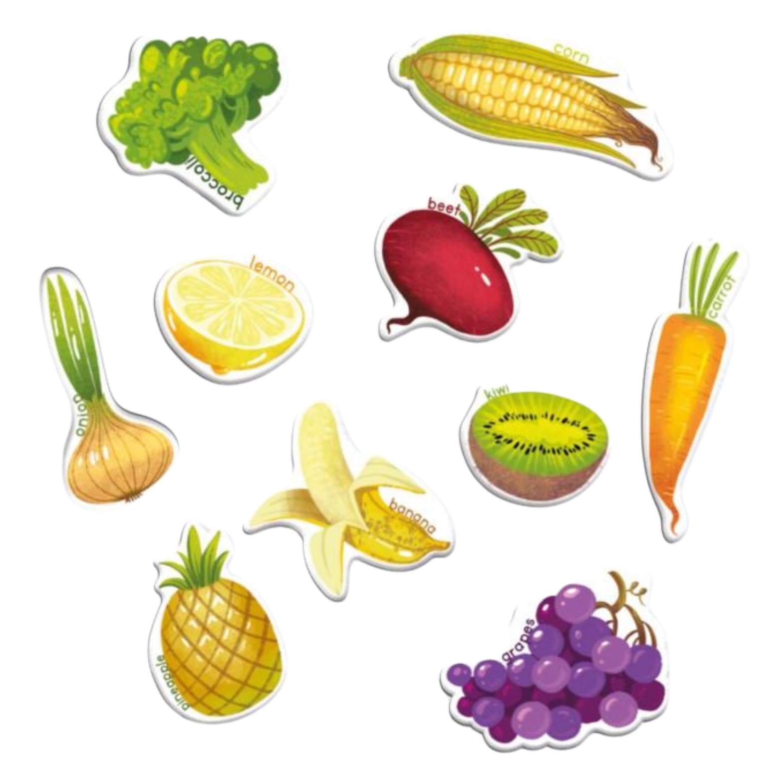 W zestawie znajdują się magnesy z różnymi owocami i warzywami, takimi jak kiwi, ananas, winogrono, kukurydza, marchewka czy burak.