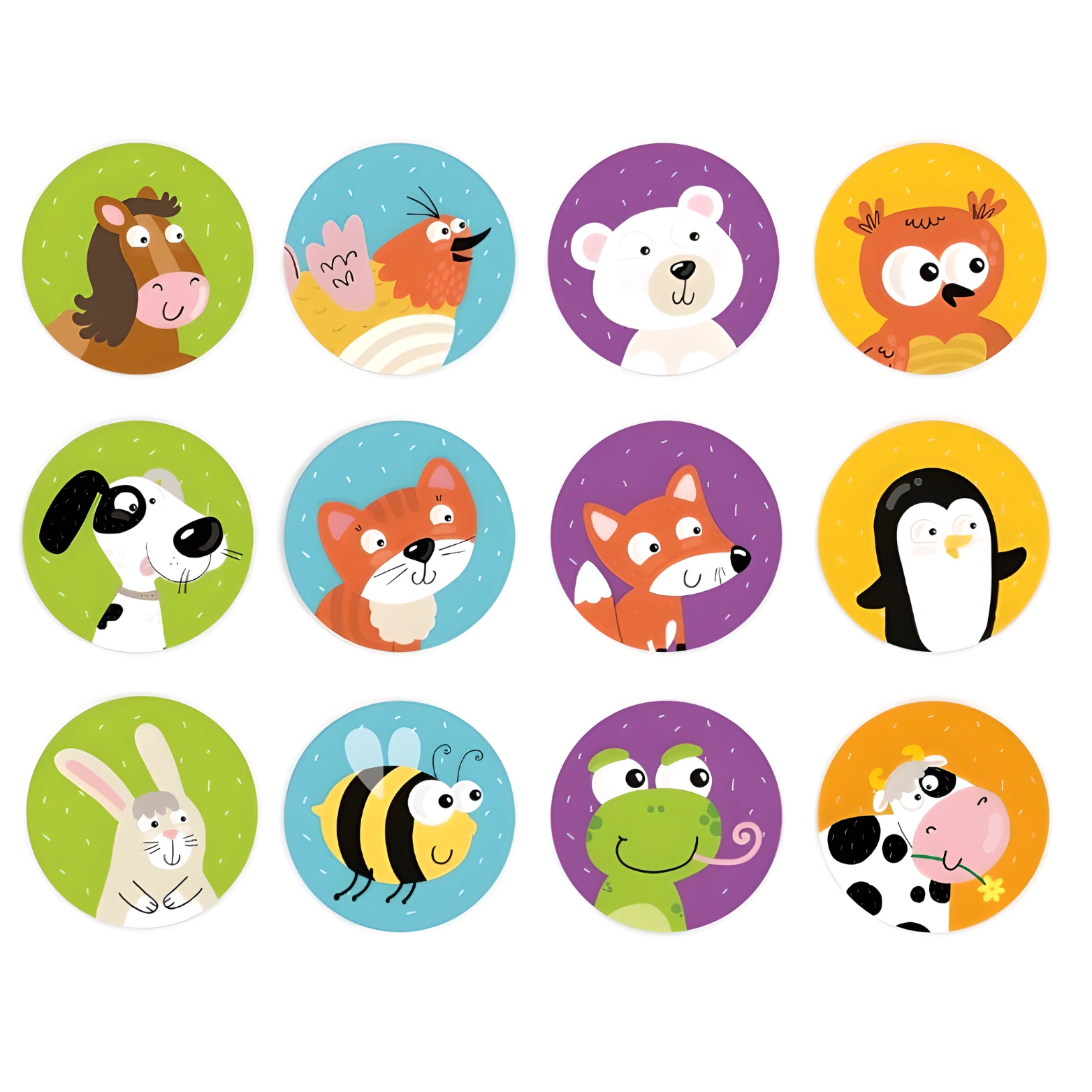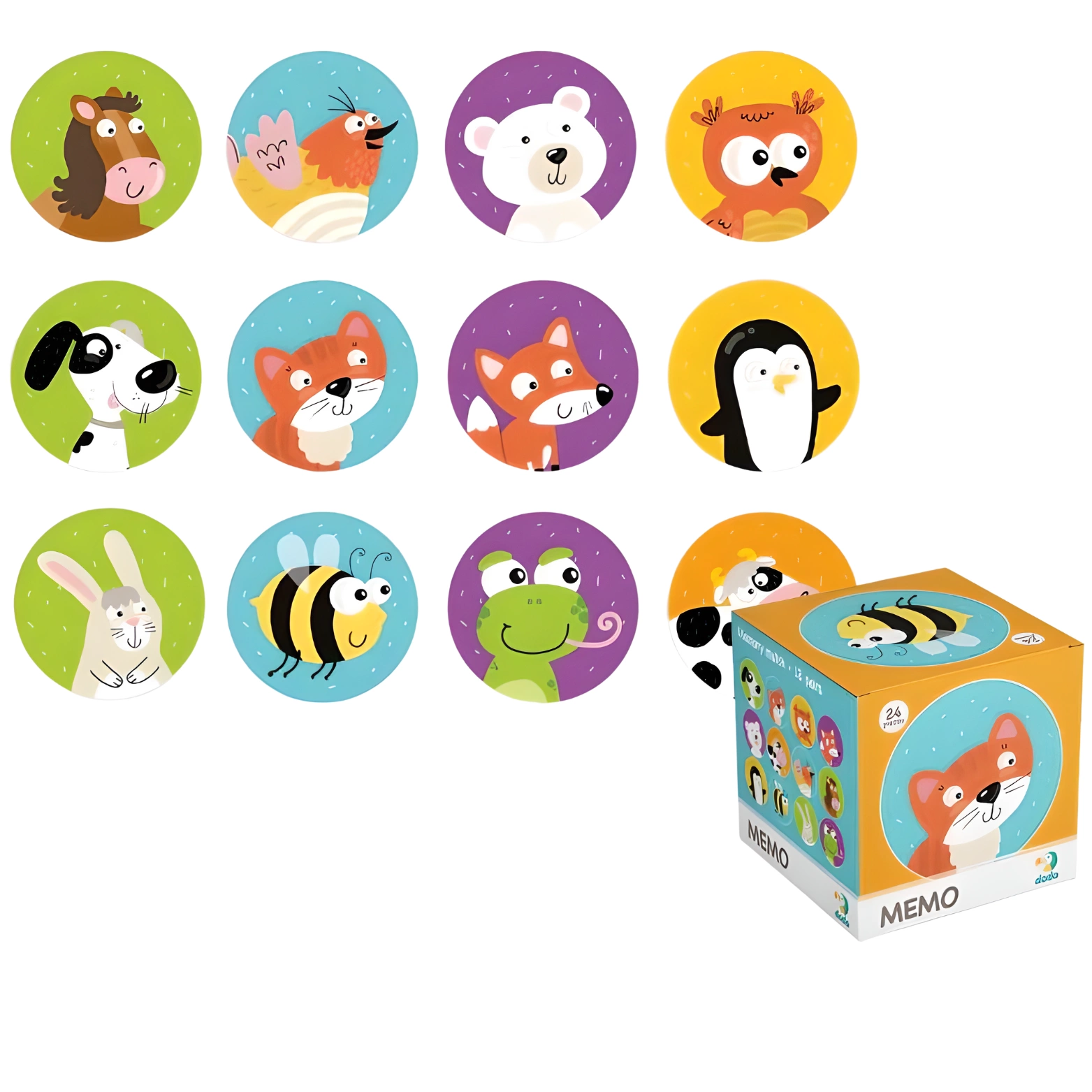 Zestaw zawiera 24 kartoniki do gry - każda para kartoników przedstawia inne urocze zwierzątko, tworząc 12 par do odnalezienia.