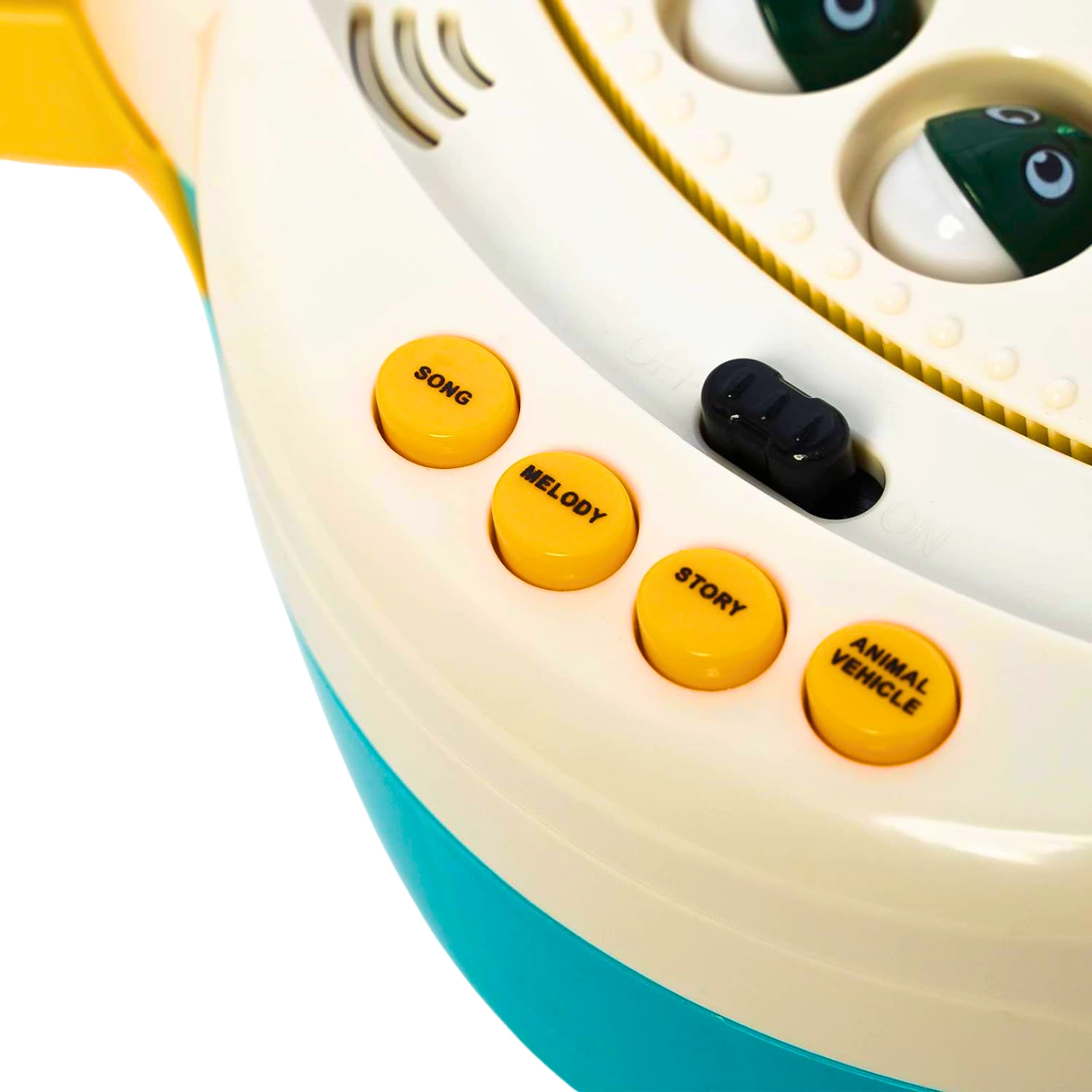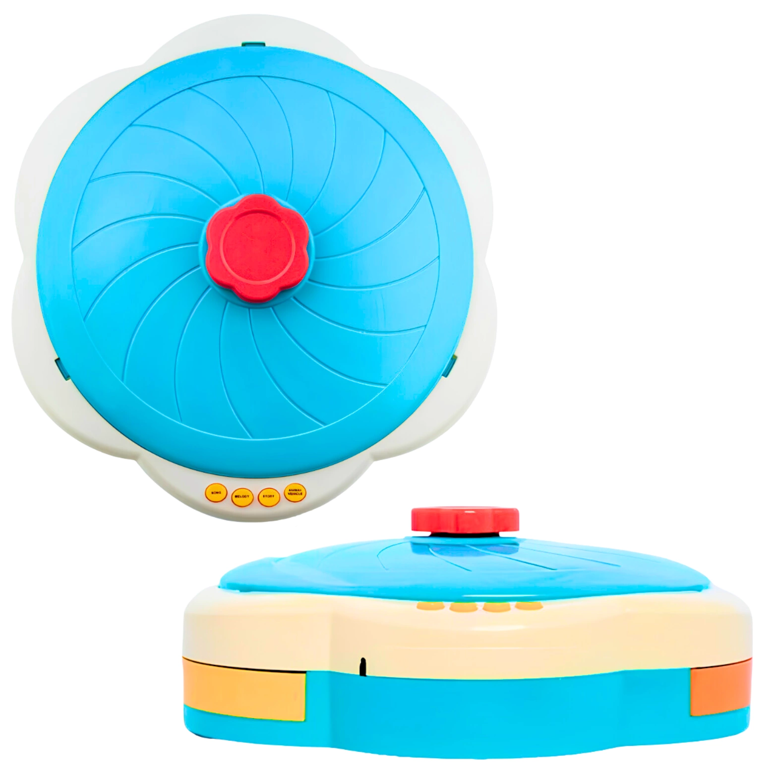 Dźwięki: Obok obrotowego elementu planszy, znajdują się cztery przyciski. Każdy z nich odpowiada za coś innego: piosenki, melodie, opowiadanie historii, zwierzęta i pojazdy (lektor w języku angielskim). Aby zabawka obracała się, wystarczy wcisnąć przycisk On/Off. Grać można z muzyką w tle lub bez.