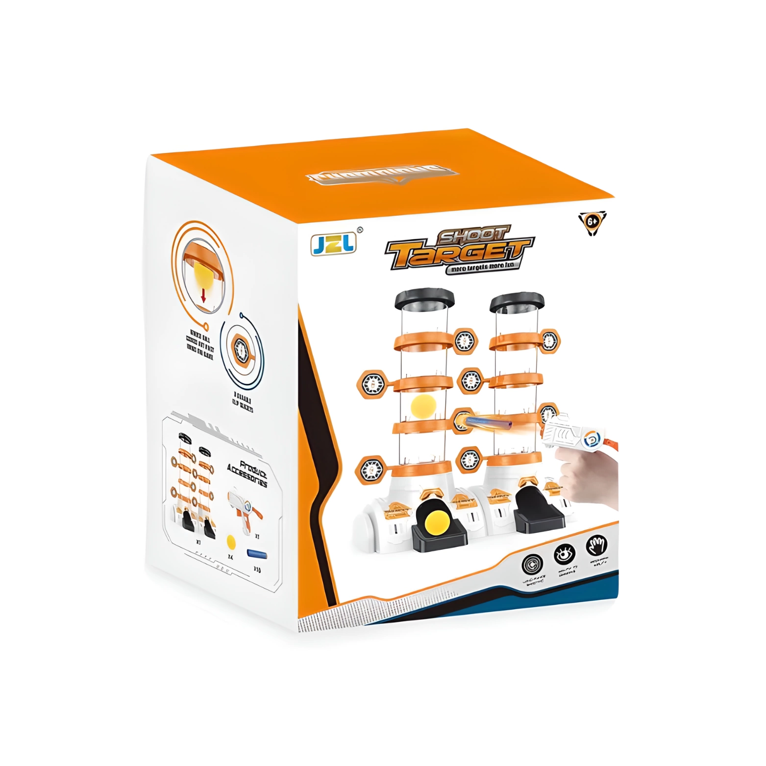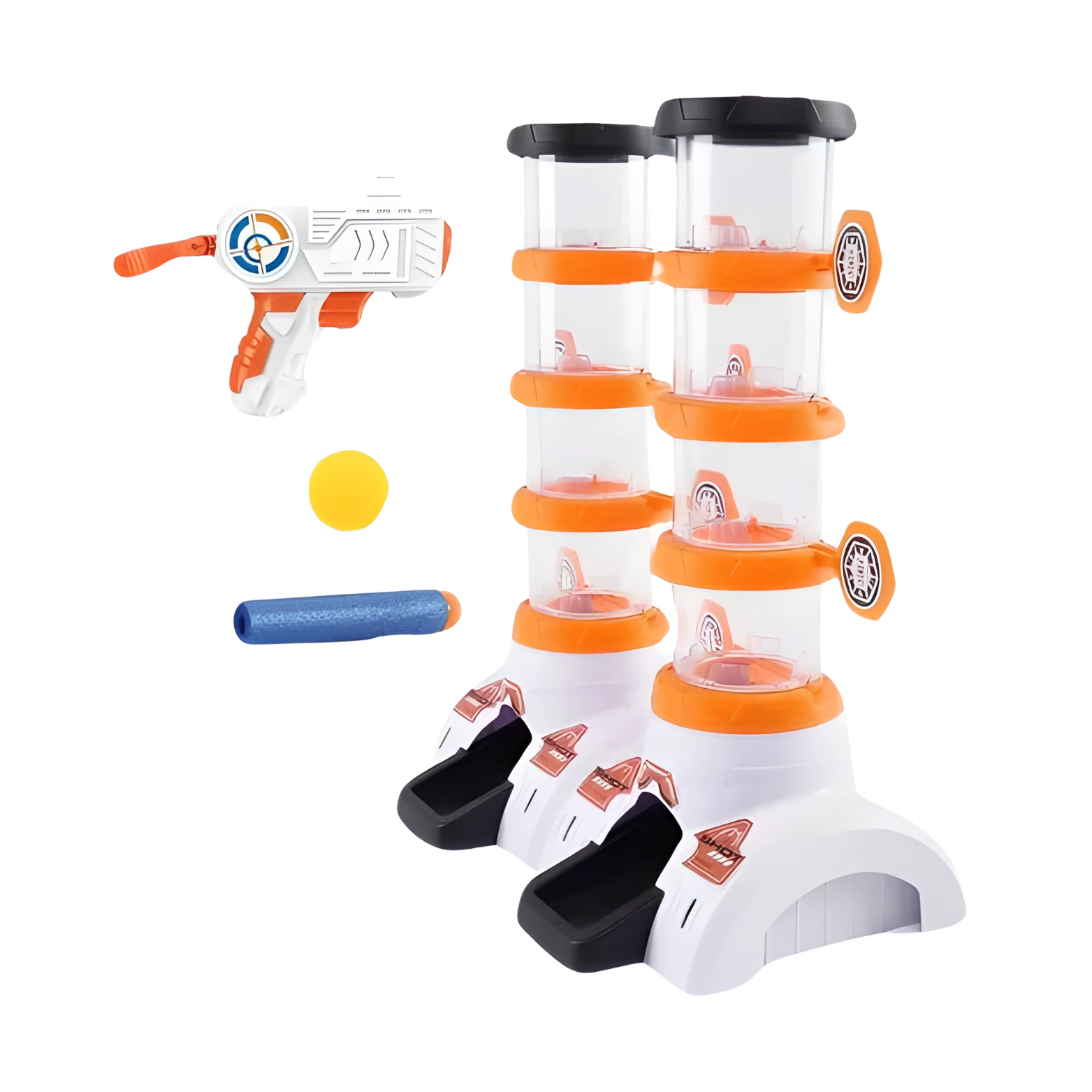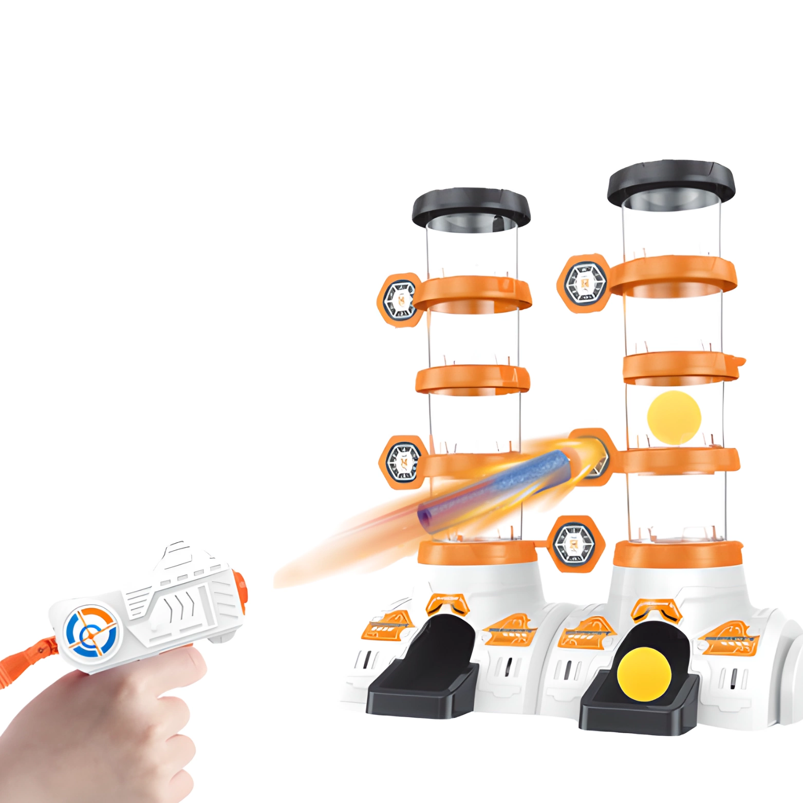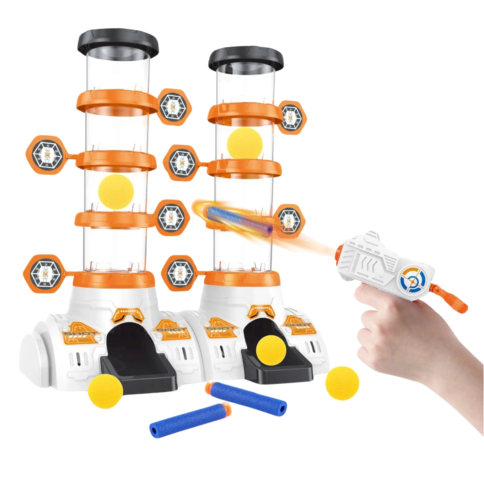 Zestaw posiada dwa cylindry, na każdym z nich znajduje się 8 tarczy. W każdym cylindrze należy umieścić jedną piłkę. Kiedy gracz trafi w cel, piłka spada poziomami na dół. Ten z graczy, który jako pierwszy trafi celnie we wszystkie tarcze i sprowadzi piłkę na sam dół wygrywa grę!