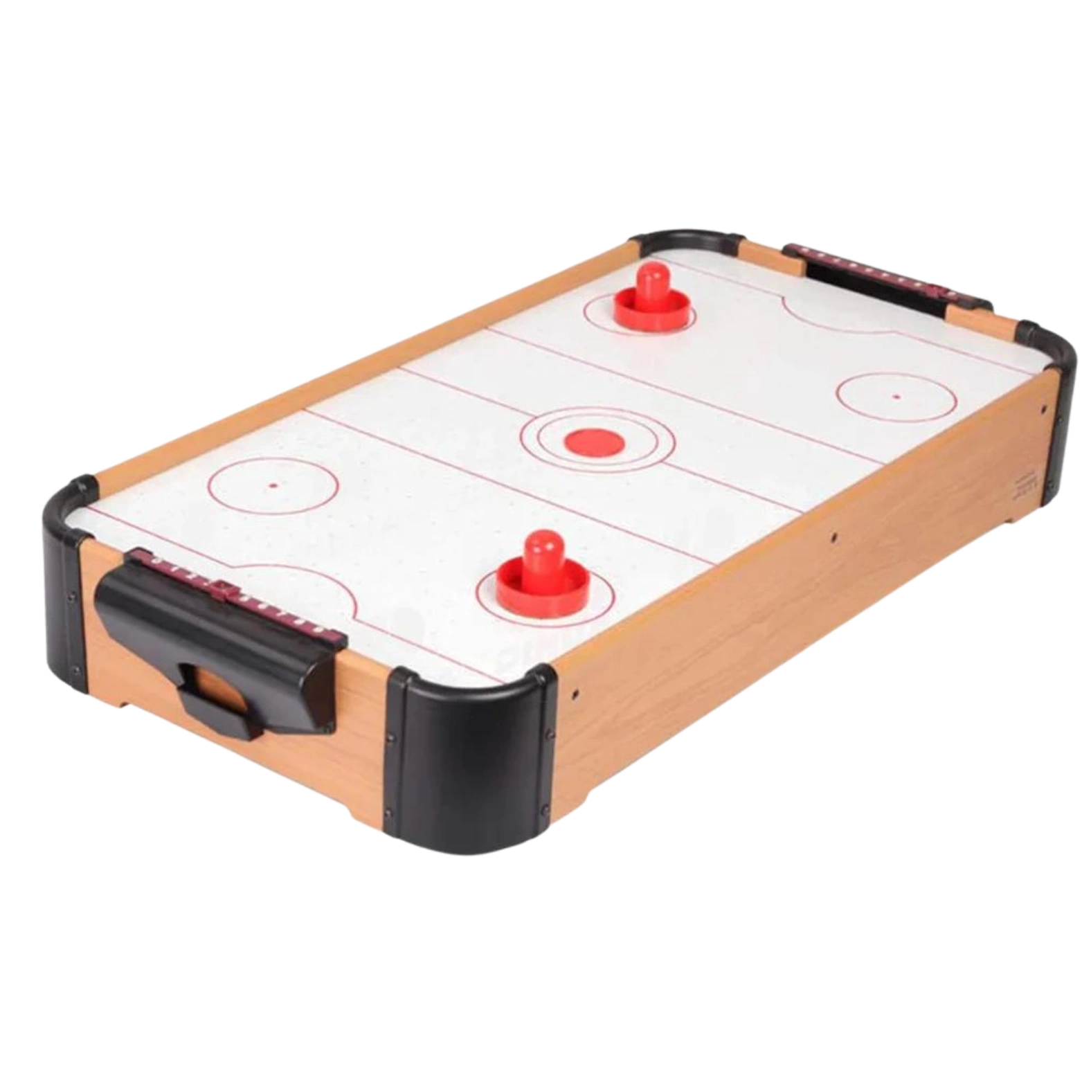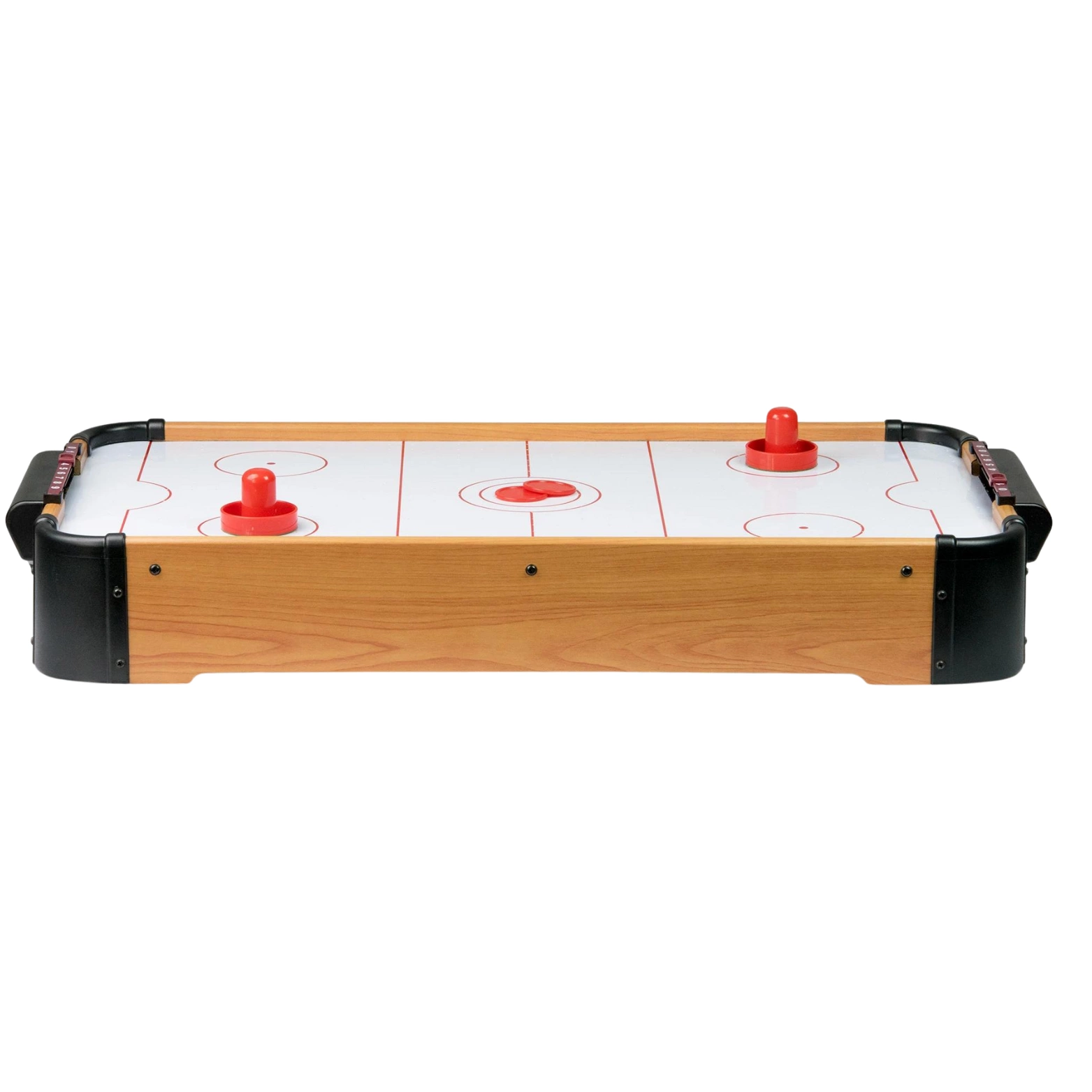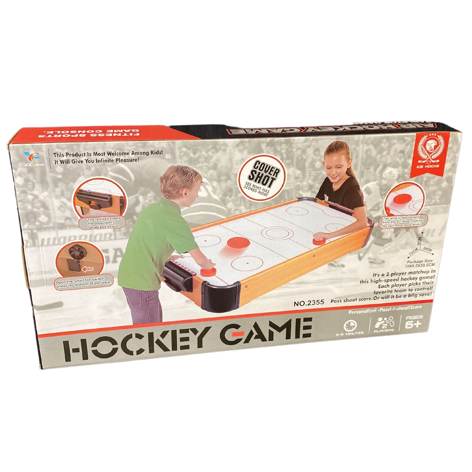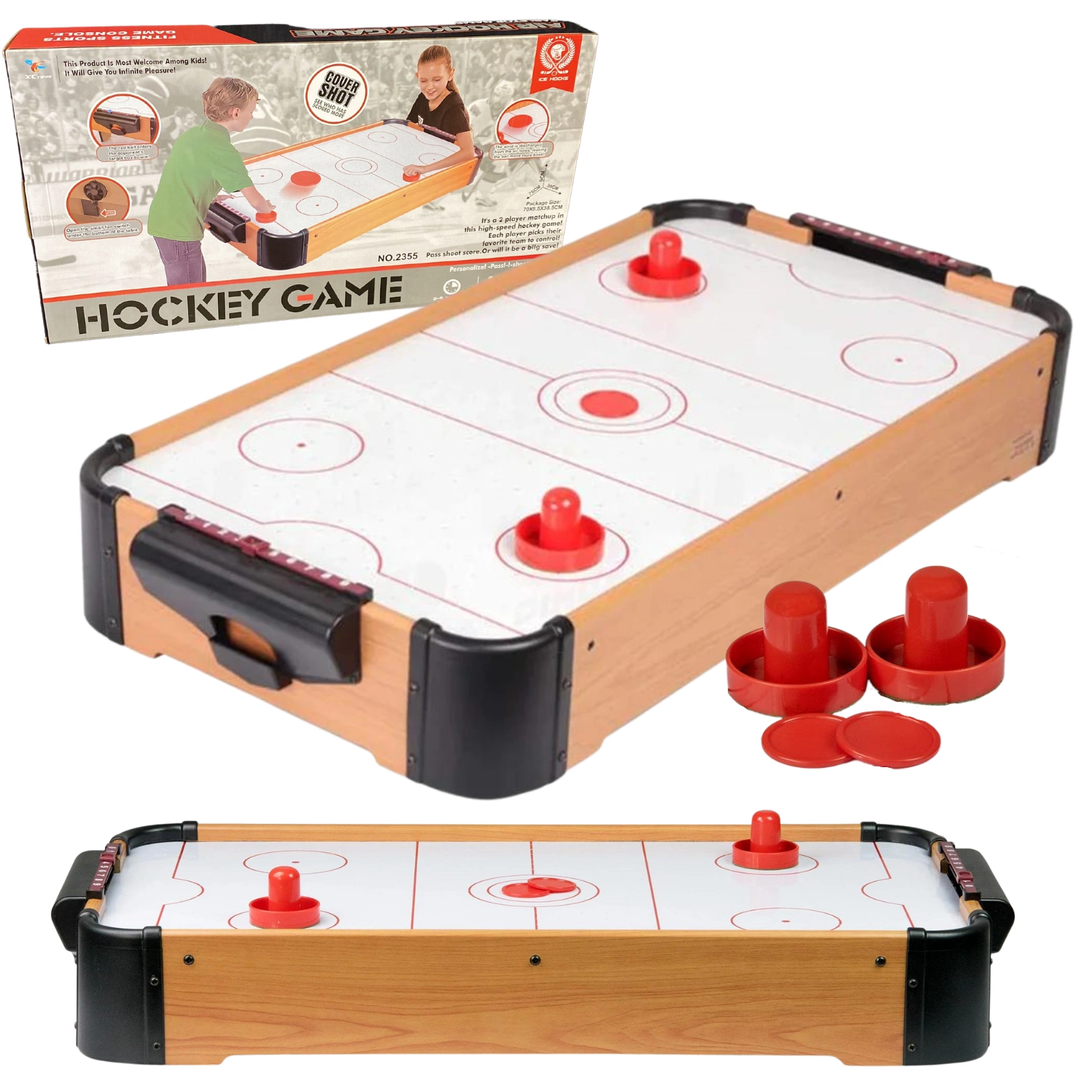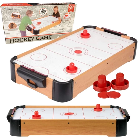 Zestaw do powietrznego hokeja składa się z miniaturowego stołu, 2 odbijaków, 2 krążków i 2 bramek wmontowanych w stół. Pod spodem znajduje się zasilany bateriami wiatrak, którego włączenie powoduje, że lekkie krążki unoszą się delikatne nad powierzchnią stołu, co niewątpliwie dodaje dynamiki grze. Odbijaki posiadają filcowe podkładki, które zapewniają płynny ruch i komfort podczas użytkowania oraz chronią powłokę stołu przed zarysowaniami.