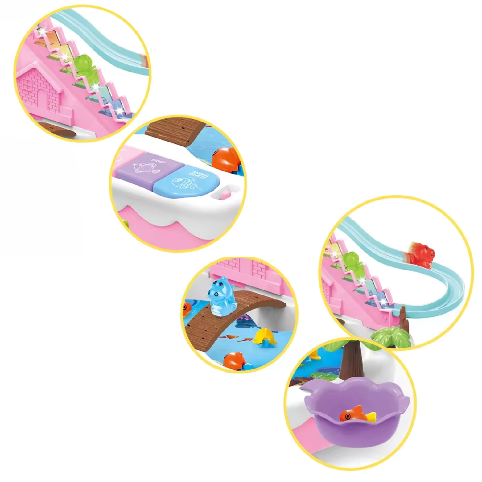 Interaktywny design z zjeżdżalnią: Zestaw oferuje ekscytującą rozrywkę z interaktywną zjeżdżalnią dla rybek, która dodaje ruchu i dynamiki, co sprawia, że zabawa jest jeszcze bardziej atrakcyjna.