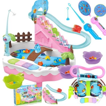 Przenieś się w magiczny świat podwodnych przygód z zestawem łowienia rybek! Ten interaktywny zestaw oferuje nie tylko tradycyjne łowienie rybek, ale także fascynującą zjeżdżalnię. Do zestawu są dołączone dinozaury, które samodzielnie dostają się do ślizgawki! Do basenu można wlać wodę, a rybki pływają wokół. Nad basenem jest pomost, dzięki którym dinozaury mogą się przemieszczać! Teraz każdy może cieszyć się łowieniem rybek za pomocą wędek i haczyków, które są przyczepione do nich.