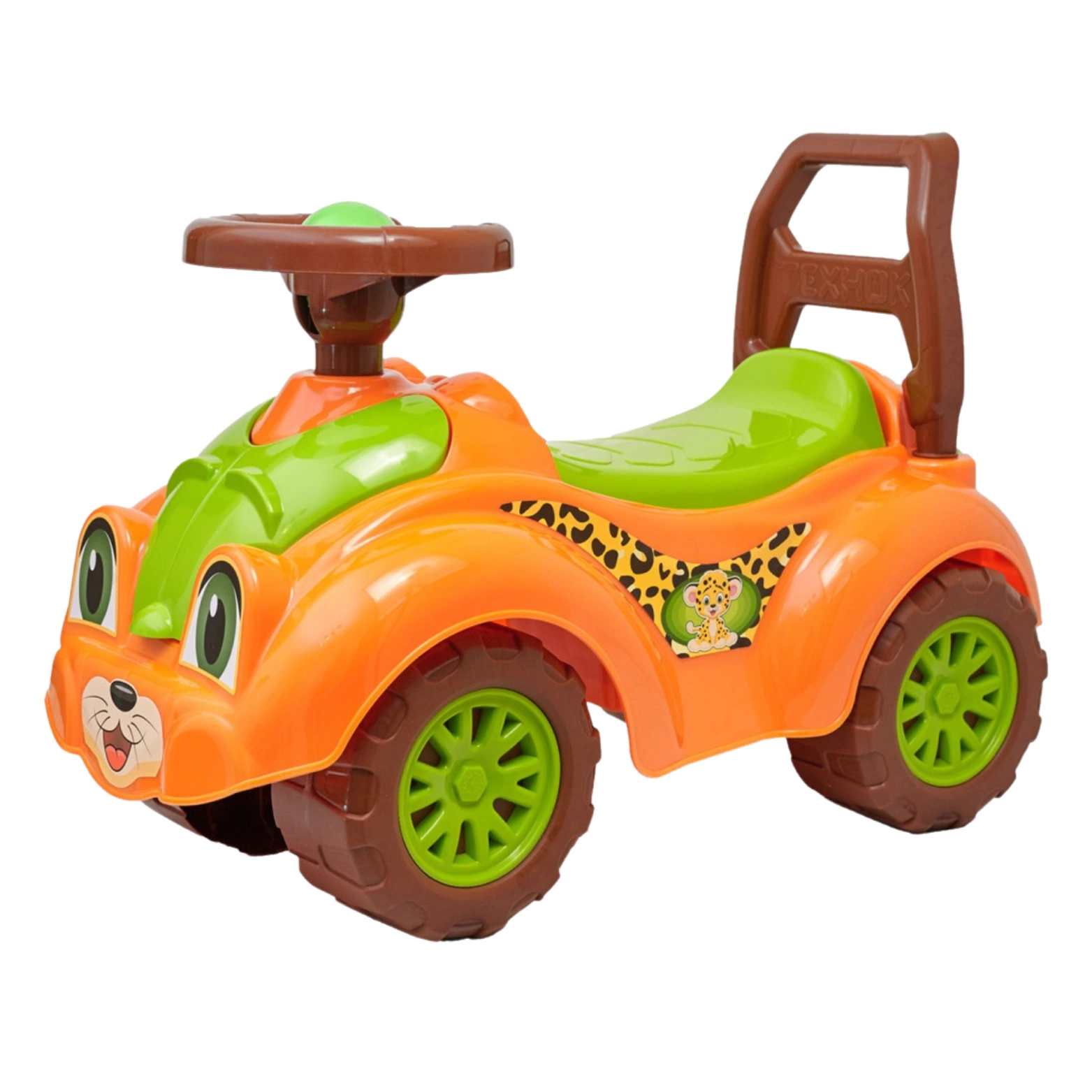 Szerokie koła z wkładką zapewniają płynną i stabilną jazdę, zarówno po gładkich podłogach w domu, jak i po nierównościach na podwórku. Dzięki temu zabawka świetnie sprawdza się w każdych warunkach. Jeździk wyposażony jest w klakson, który dodaje dodatkowej radości podczas jazdy.