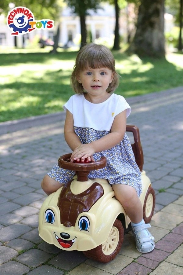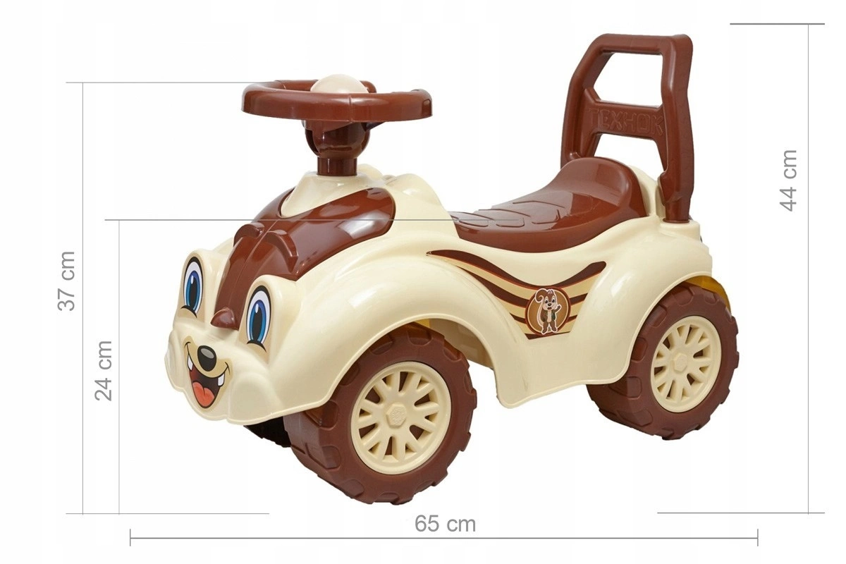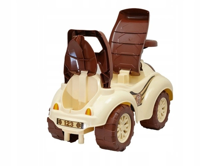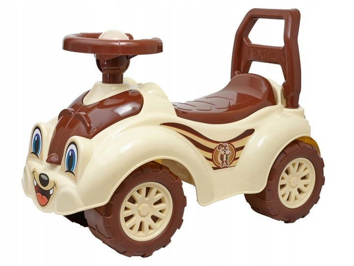 Brązowo-beżowa kolorystyka, z buźką na masce zachęci dziecko do korzystania z pojazdu. Bezpieczny materiał, pozbawiony ostrych krawędzi zapewni przyjemną zabawę.