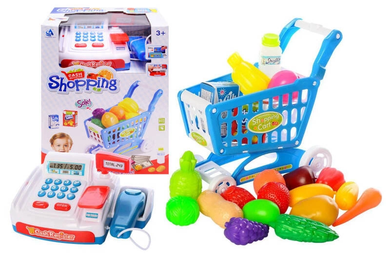 Zabawka z efektami dźwiękowymi na baterie. Otwieraną szufladą na pieniądze. W zestawie wózek sklepowy z owocami, produkty spożywcze do kasowania.