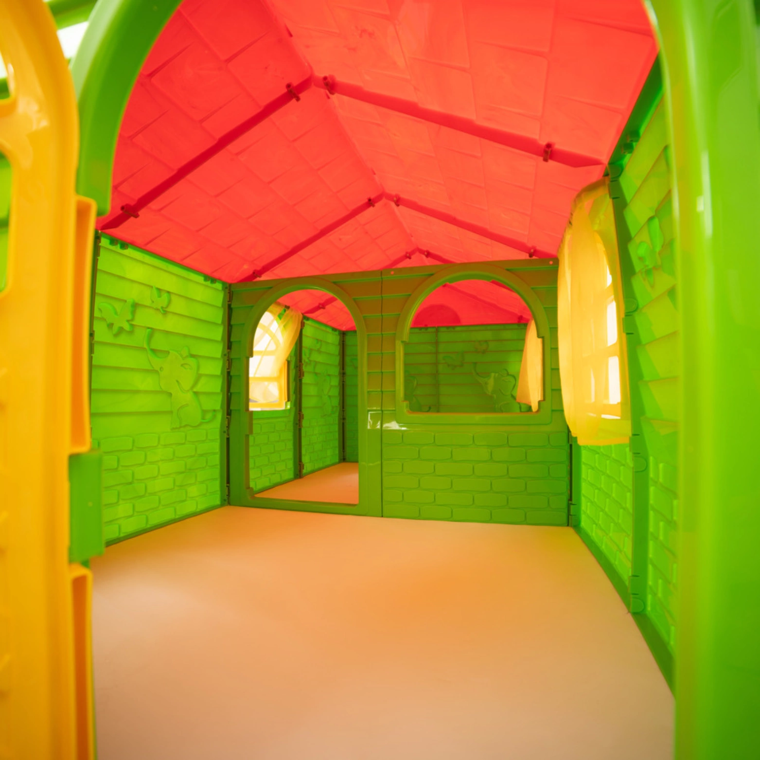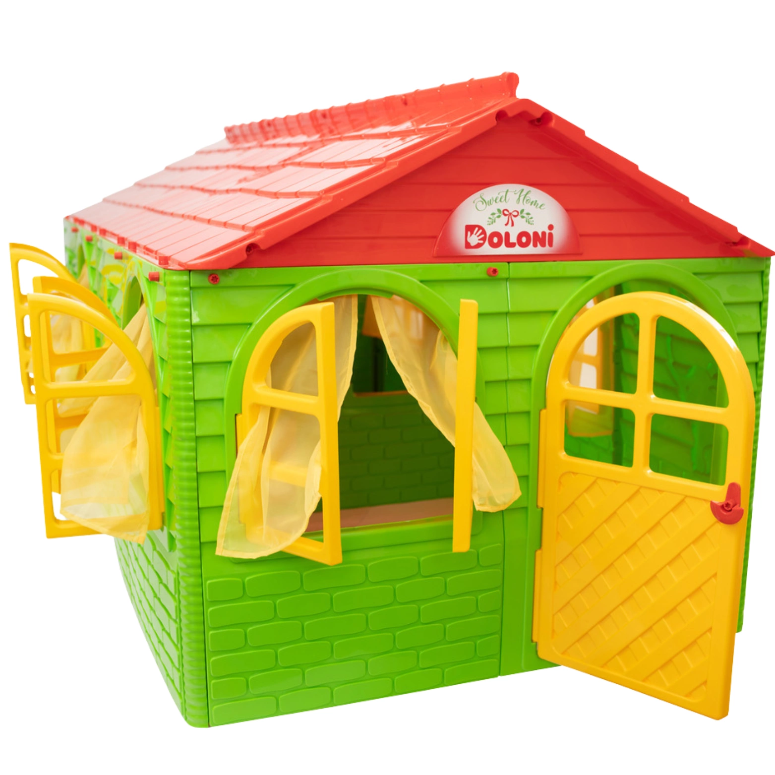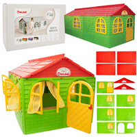 Domek posiada aż pięć okien z otwieranymi okiennicami oraz zasłonami, które umożliwiają regulację światła i wentylację. Dodatkowo, wyposażony jest w otwierane drzwi wejściowe, które zapewniają łatwy dostęp do wnętrza. To idealne miejsce do zabawy i spędzania czasu na świeżym powietrzu lub w przytulnym wnętrzu domu.