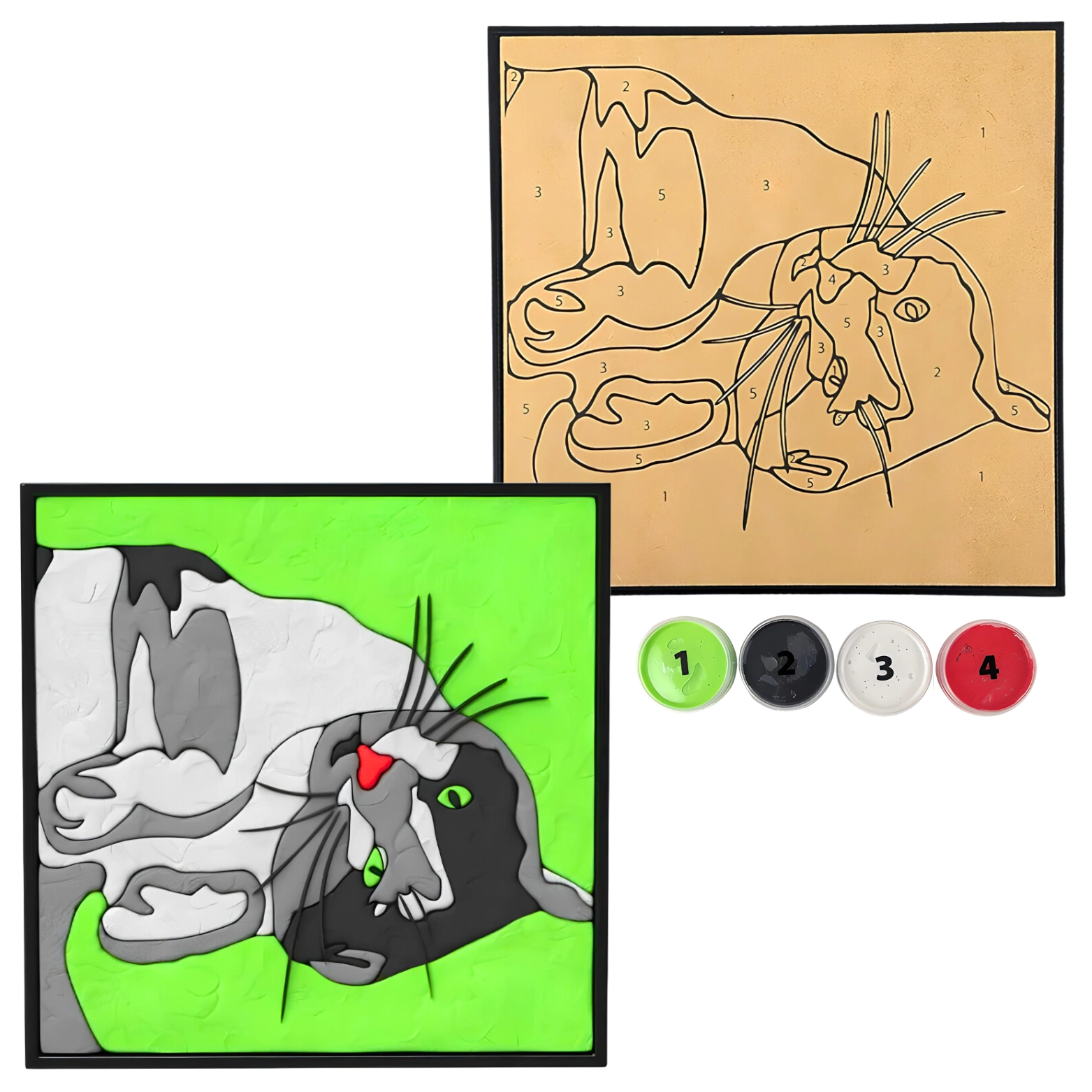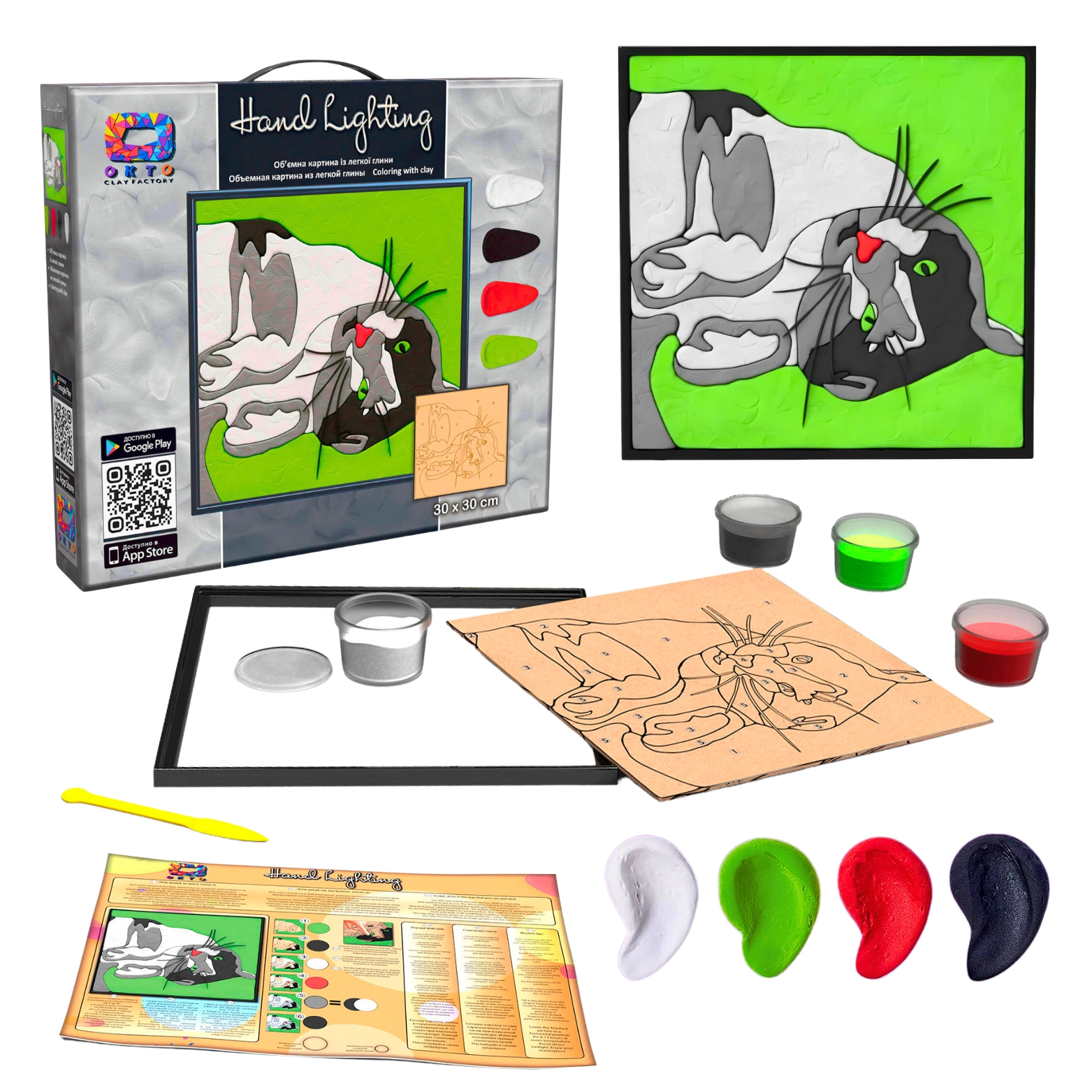 Wyjątkowe tworzenie: Obraz tworzy się dołączoną do zestawu plasteliną. Na dołączonym wydruku widnieje podpowiedź, w których miejscach nałożyć jakie kolory, lecz można też puścić wodzę wyobraźni i stworzyć swój własny, niepowtarzalny projekt. Dla ułatwienia dołączona została plastikowa szpatułka. Jeśli artysta chce, aby jego dzieło zostało utrwalone - wystarczy poczekać ok. 3 dni, by masa całkowicie zaschła. Gotowy obraz można zawiesić w honorowym miejscu.