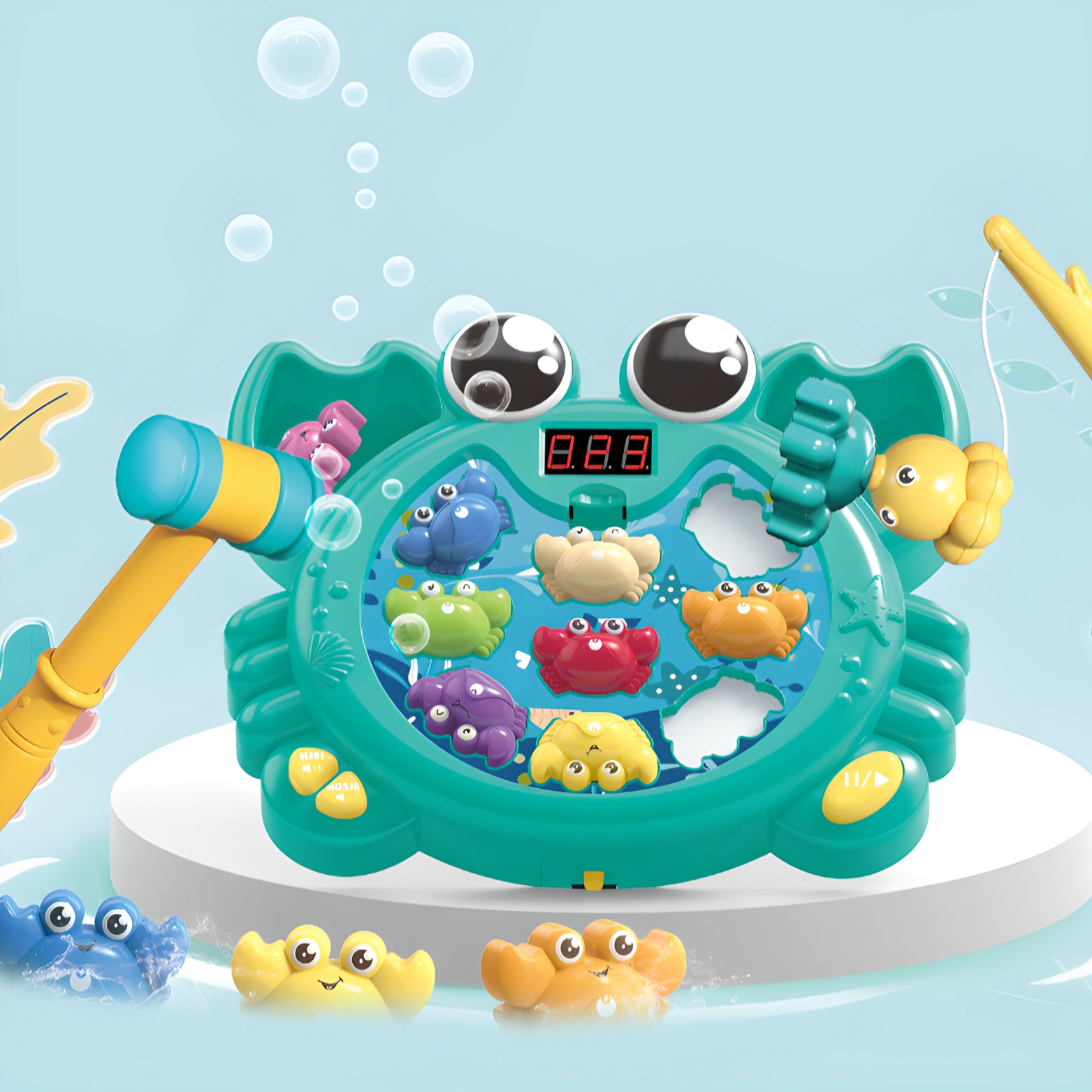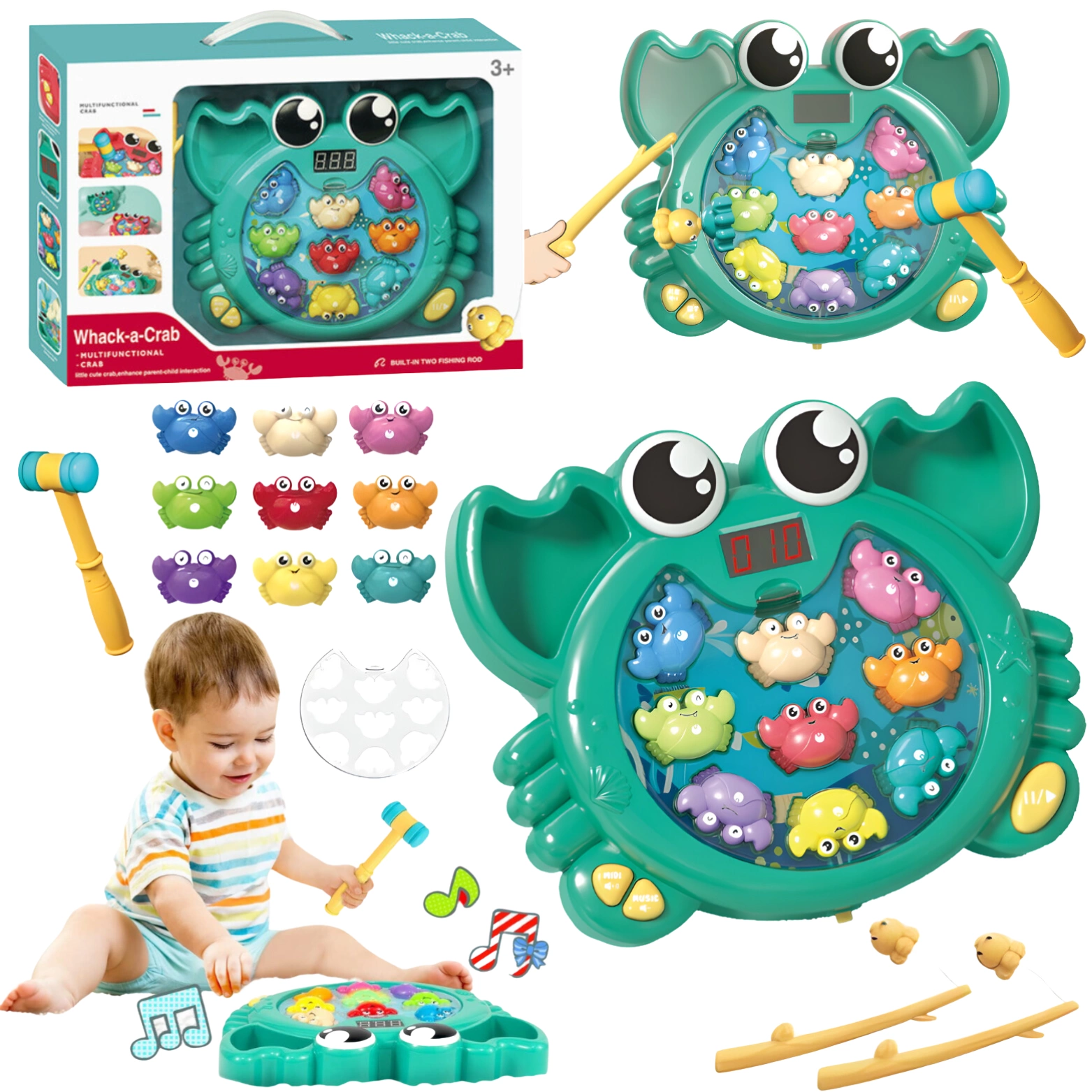 Pierwsza z tych gier to - Uderz Kraba. Duży krab jest wyposażony w elektroniczny licznik, który rejestruje każde trafienie młoteczkiem! Malutkie kraby umieszczone wewnątrz kraba zaczynają migotać kolorami - co oznacza że należy uderzać w te kraby, które się zaświecają. Punkty za każde trafienie są sumowane na liczniku, co sprawia, że gra staje się jeszcze bardziej ekscytująca. Dzieci będą się starać zdobyć jak najwięcej punktów, uderzając w migoczące kraby. To doskonały sposób na rozwijanie zręczności i refleksu.