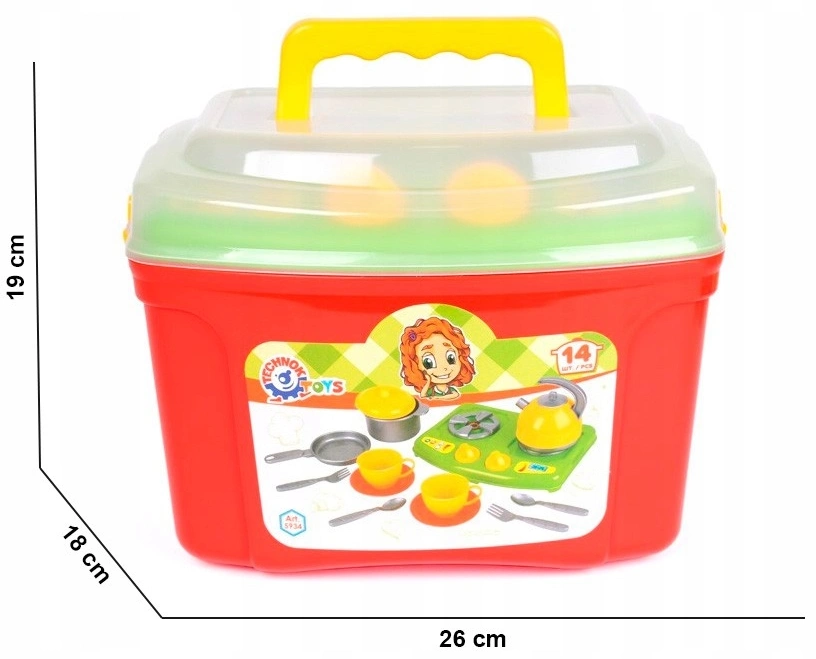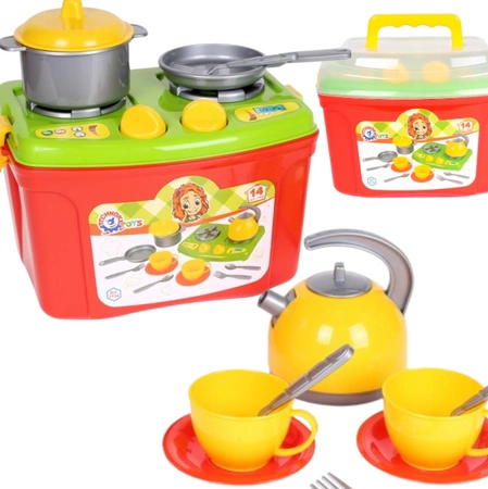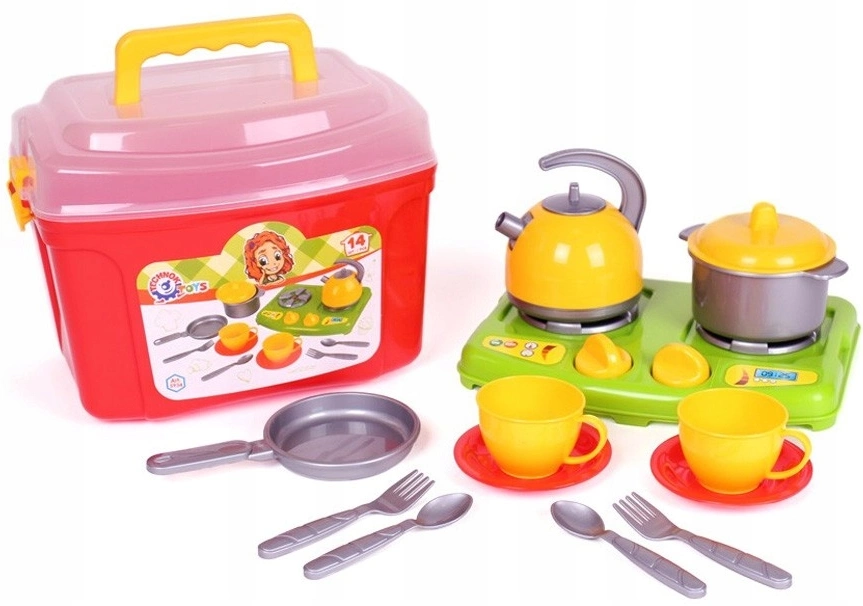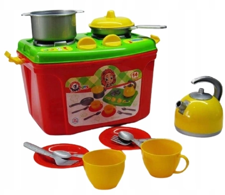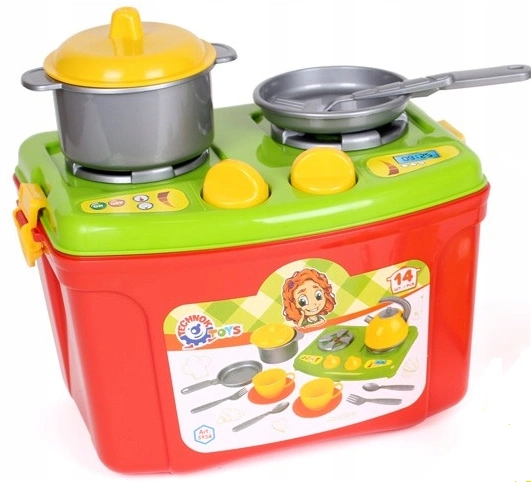 Masz w domu mała kucharkę lub małego kucharza? Jeśli twoje dziecko uwielbia gotować, razem pieczecie wyśmienite ciasta lub pyszne obiady, to od teraz będzie ono miało pole do popisu! Przedstawiamy duża kuchenkę dla dzieci! Oprócz kuchenki, zestaw posiada również garnki, talerze, sztućce. Poręczna SKRZYNIA, która po rozłożeniu staje się przenośną kuchenką, z pełnym wyposażeniem dla małego, ale w pełni profesjonalnego kucharza, do przygotowania najsmaczniejszych dań dla swojej mamy i taty.