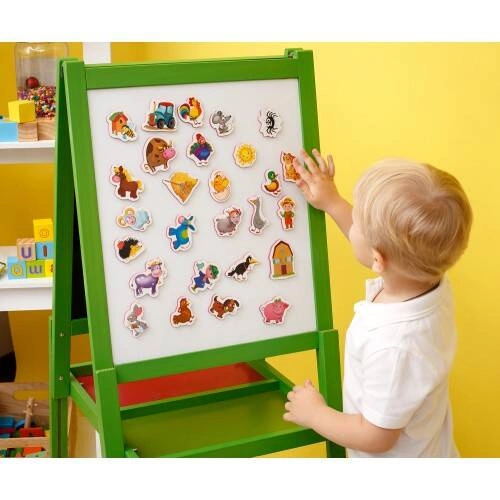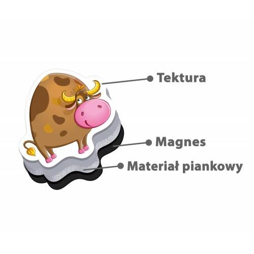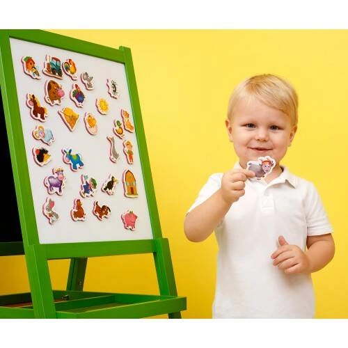 Każdy element zestawu to magnes z wyjątkową ilustracją, która przedstawia zwierzęta i przedmioty związane z życiem na farmie. Jest to idealny zestaw dla małych dzieci.