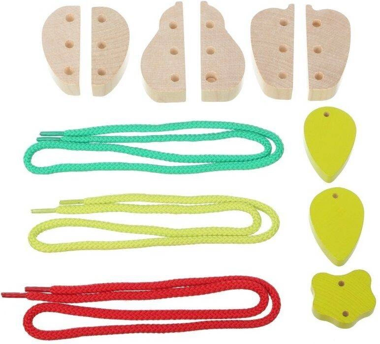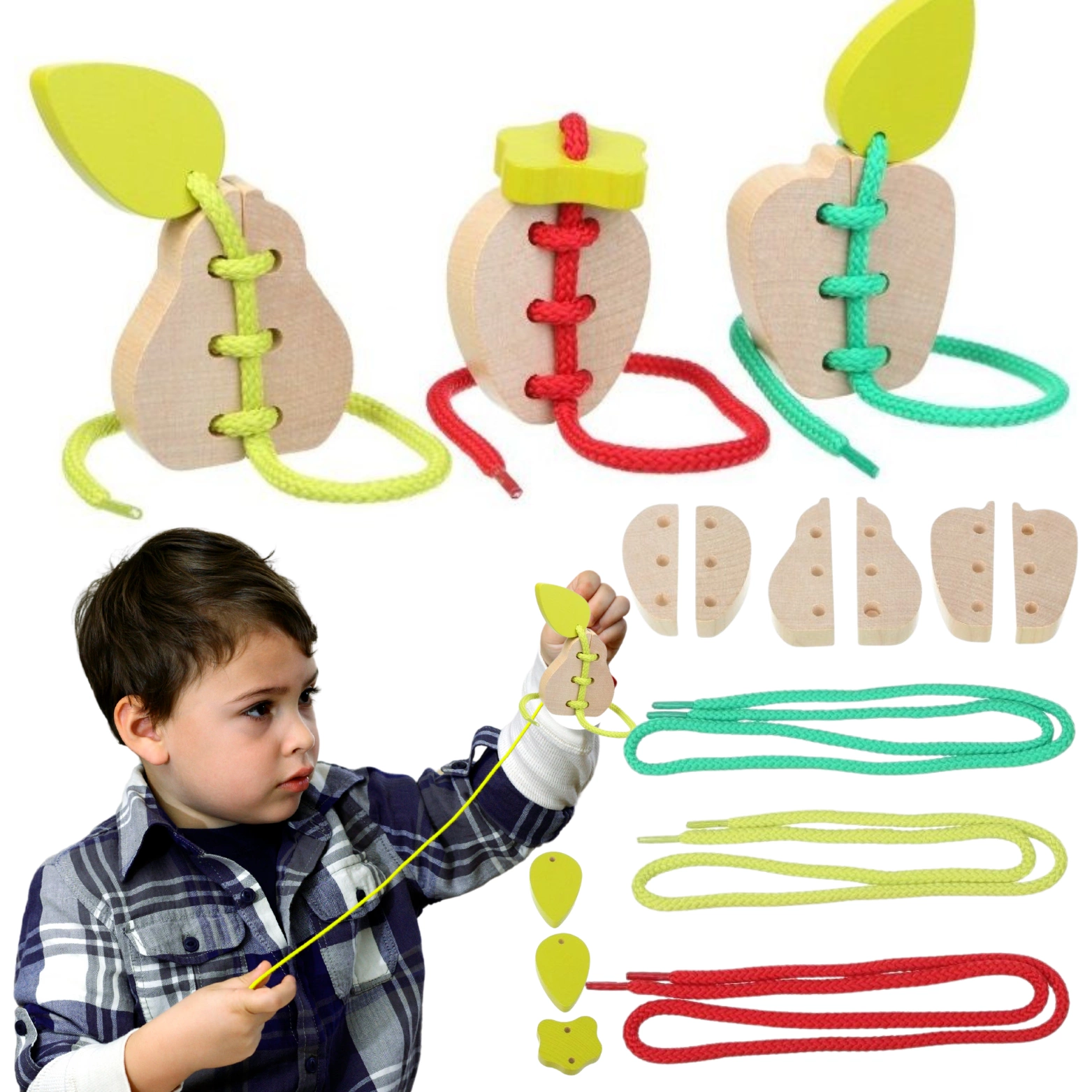 Zestaw składa się z połówek owoców różnych kształtów m.in jabłko, gruszka. Każda połówka posiada otwory oraz sznurki. Dzieci mogą zabawić się w przewlekanie owoców na sznurku, dopasowując odpowiednie owoce. Przewlekanie to idealne ćwiczenie do ćwiczenia paluszków małych dzieci.