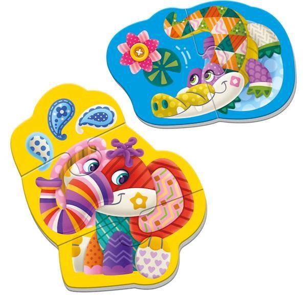W komplecie znajdują się dwa duże obrazki, które przedstawiają urocze zwierzęta - słonia i krokodyla. Dzięki fantazyjnym kolorowym postaciom zwierząt z różnymi wzorami geometrycznymi, maluch nie tylko będzie miał świetną zabawę, ale również poćwiczy swoje zdolności obserwacyjne i poznaje różnorodne wzory.