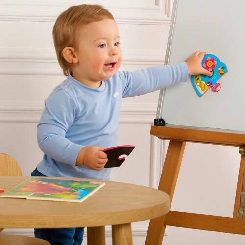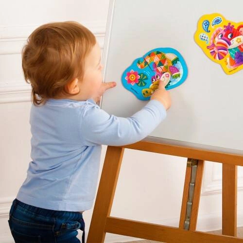 Każdy obrazek został podzielony na różne elementy, co pomaga dziecku nauczyć się łączyć osobne części w jedną całość. Zadaniem dziecka jest połączenie tych elementów puzzli w taki sposób, aby ułożyć pełne postacie słonia i krokodyla. Ponadto, elementy puzzli są magnetyczne, co oznacza, że dziecko może się nimi bawić na dowolnej metalowej powierzchni, takiej jak tablica magnetyczna lub podkładka magnetyczna.