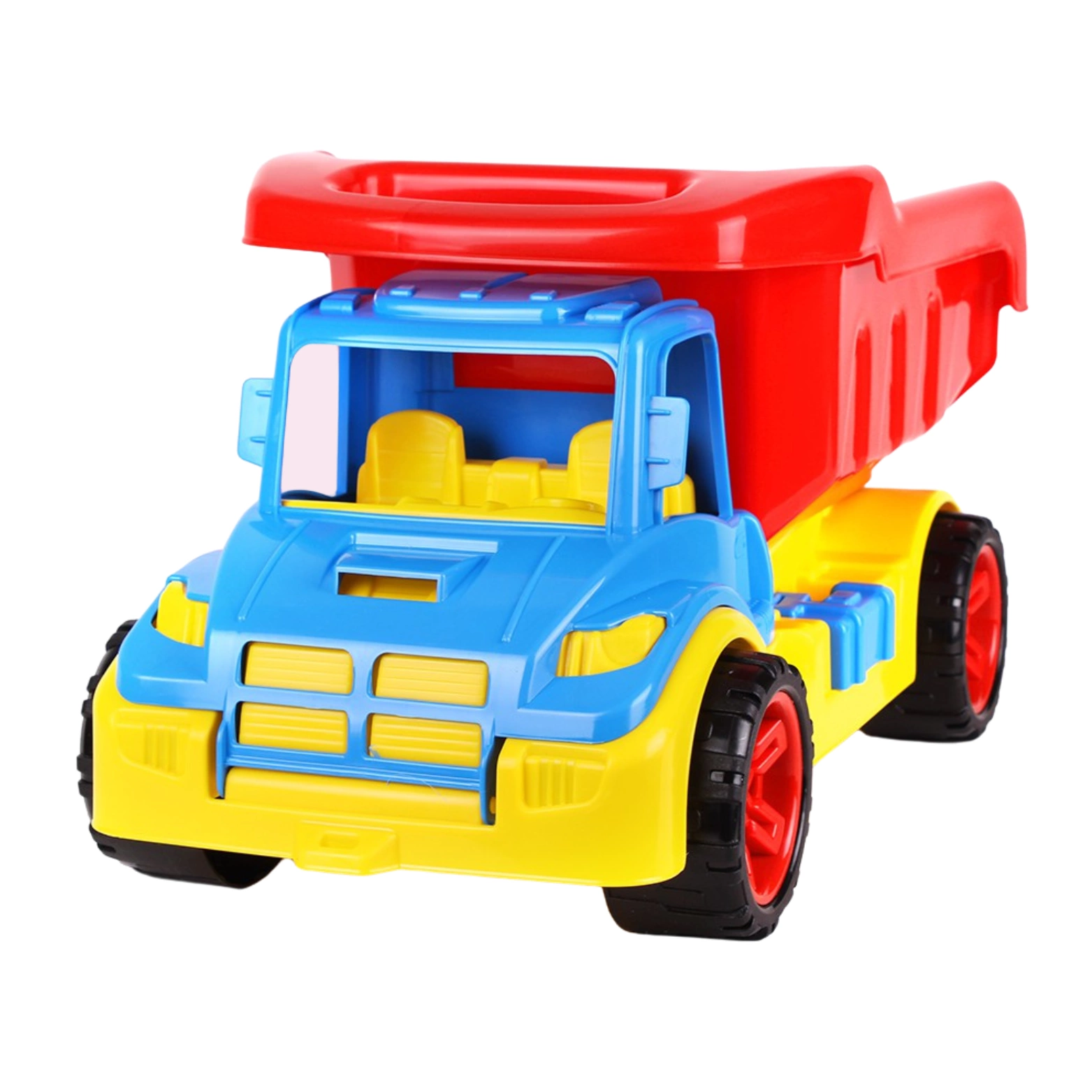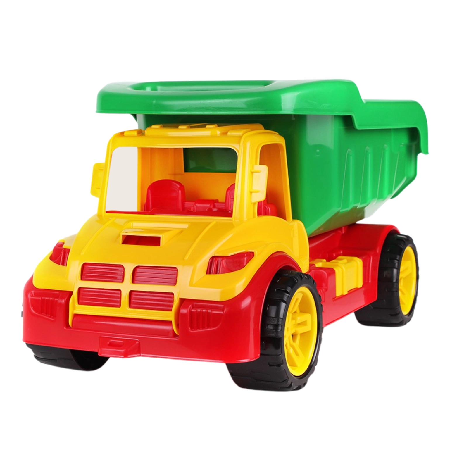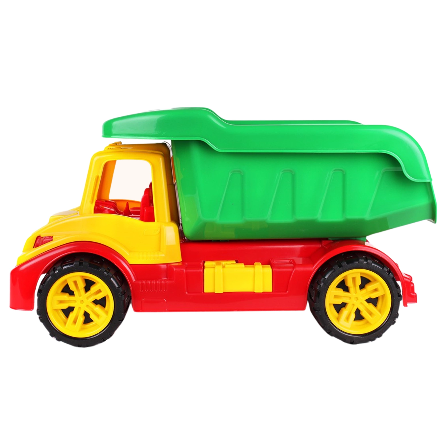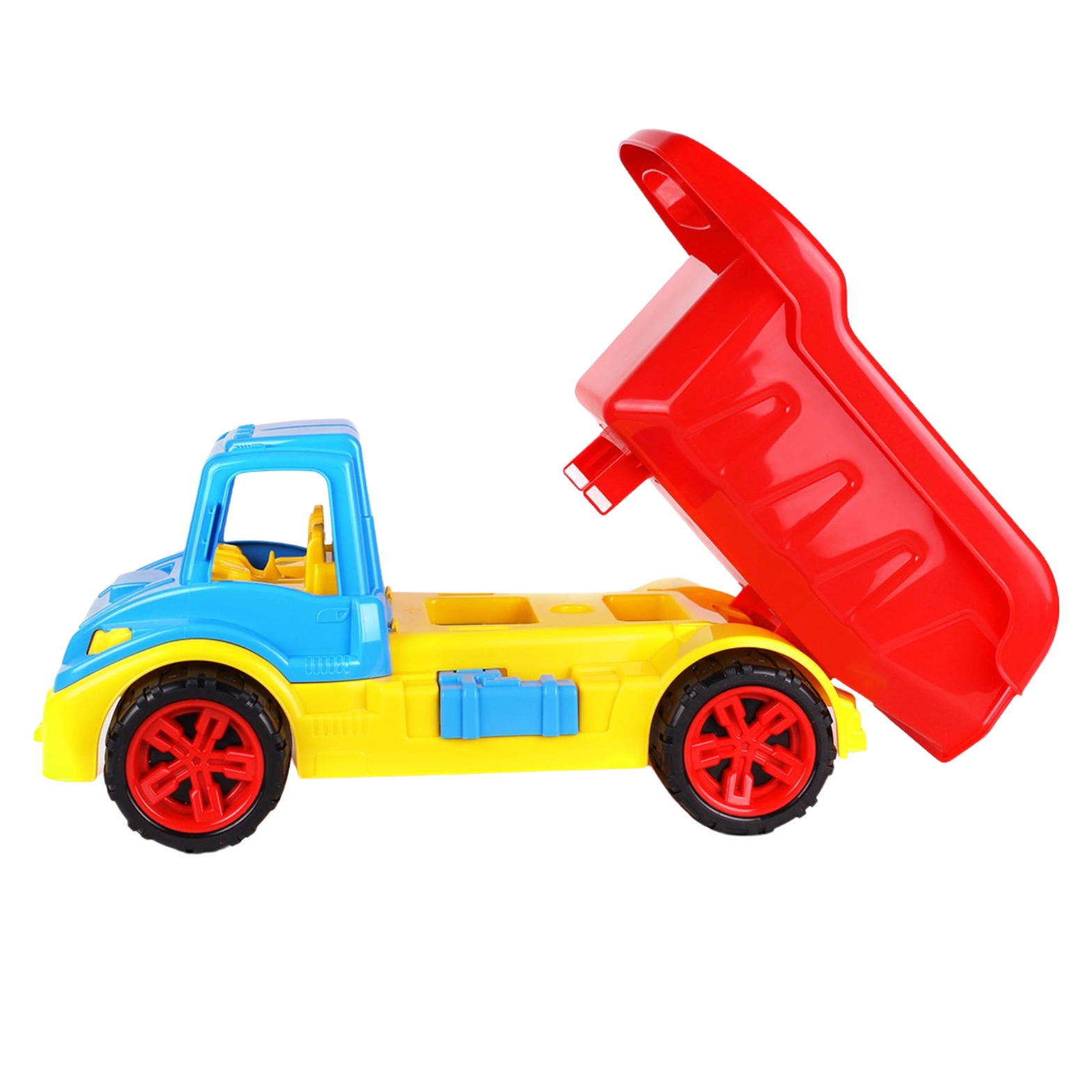 Koła z obrotowym mechanizmem są zamontowane na solidnych osiach, co zapewnia płynną jazdę i dodatkową trwałość. Kabina wywrotki została zaprojektowana bez szynek, co umożliwia łatwy dostęp do wnętrza. Dziecko może wkładać ręce i eksplorować wnętrze jak prawdziwy kierowca. Kabina zawiera również realistyczną imitację siedzeń i skrzyni biegów.