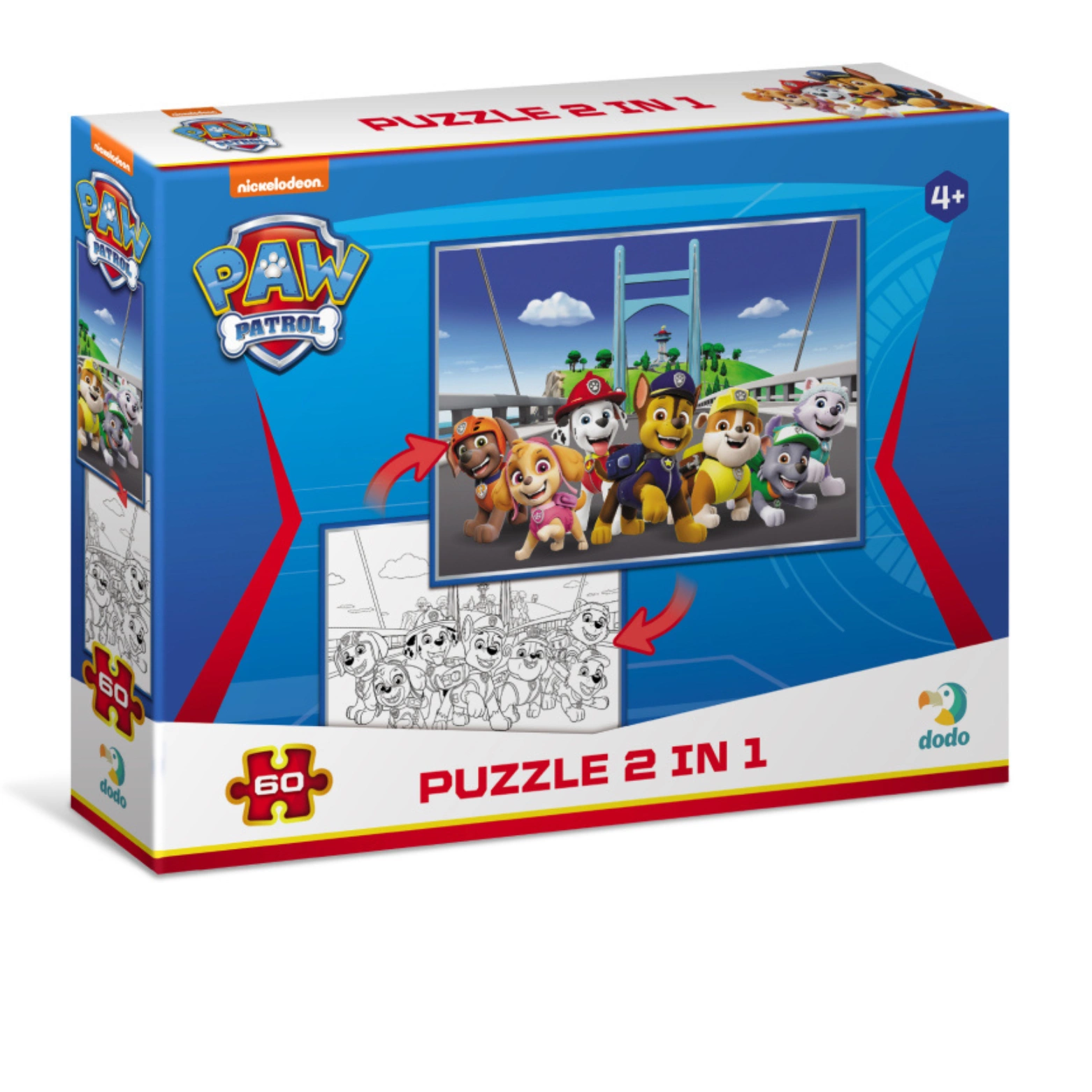 "Puzzle Psi Patrol 2w1" to doskonała zabawa dla najmłodszych miłośników bohaterów z bajki Psi Patrol. Zestaw składa się z 60 elementów, które po ułożeniu tworzą fascynujący obrazek z ulubionymi postaciami. Dzieci powyżej 3 roku życia mogą cieszyć się układaniem puzzli, rozwijając jednocześnie swoje umiejętności manualne, koncentrację i logiczne myślenie.