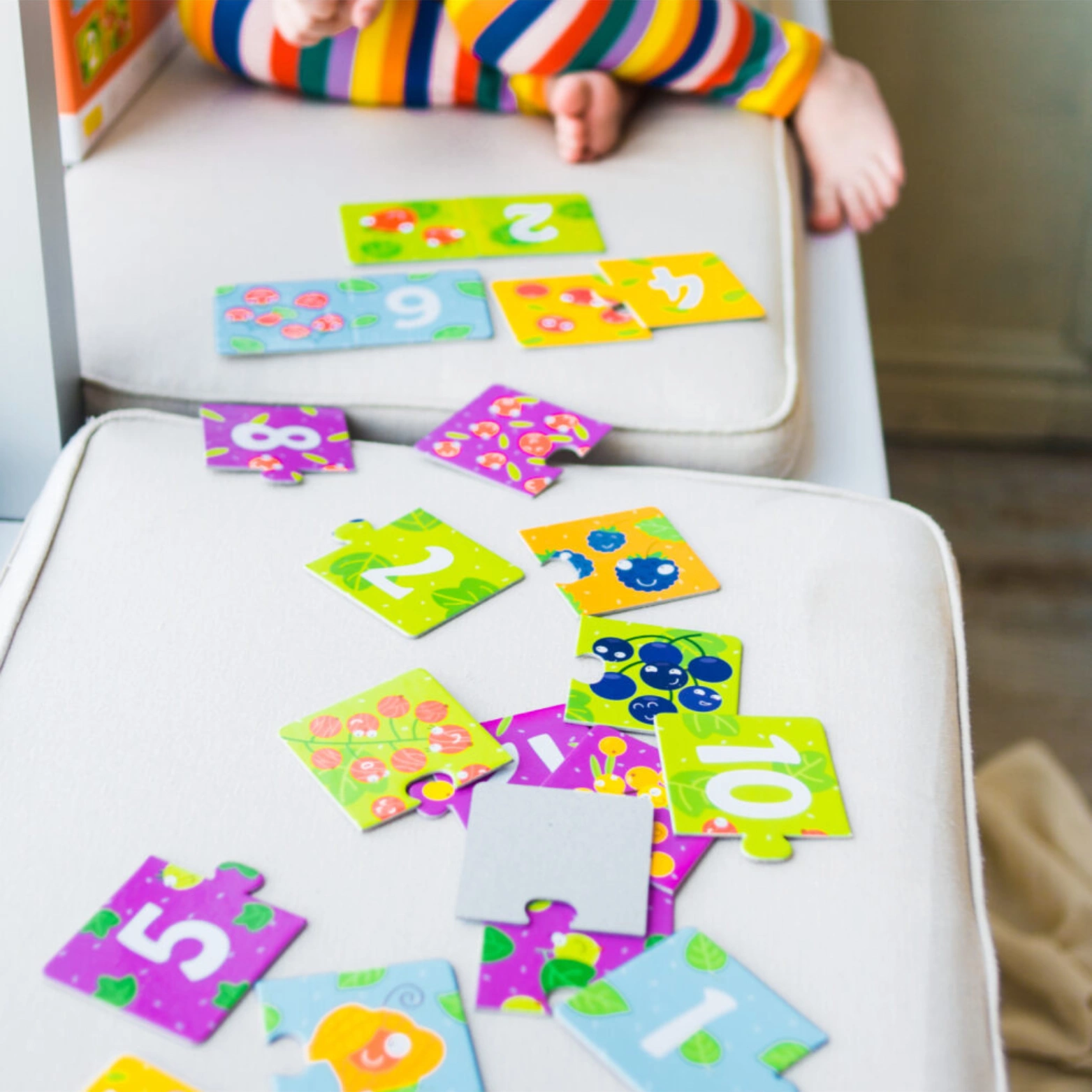Nauka liczenia: każda układanka przedstawia owoce w różnej ilości, które należy dopasować do odpowiedniej cyferki. To nie tylko zabawa, to także nauka podstaw matematyki.