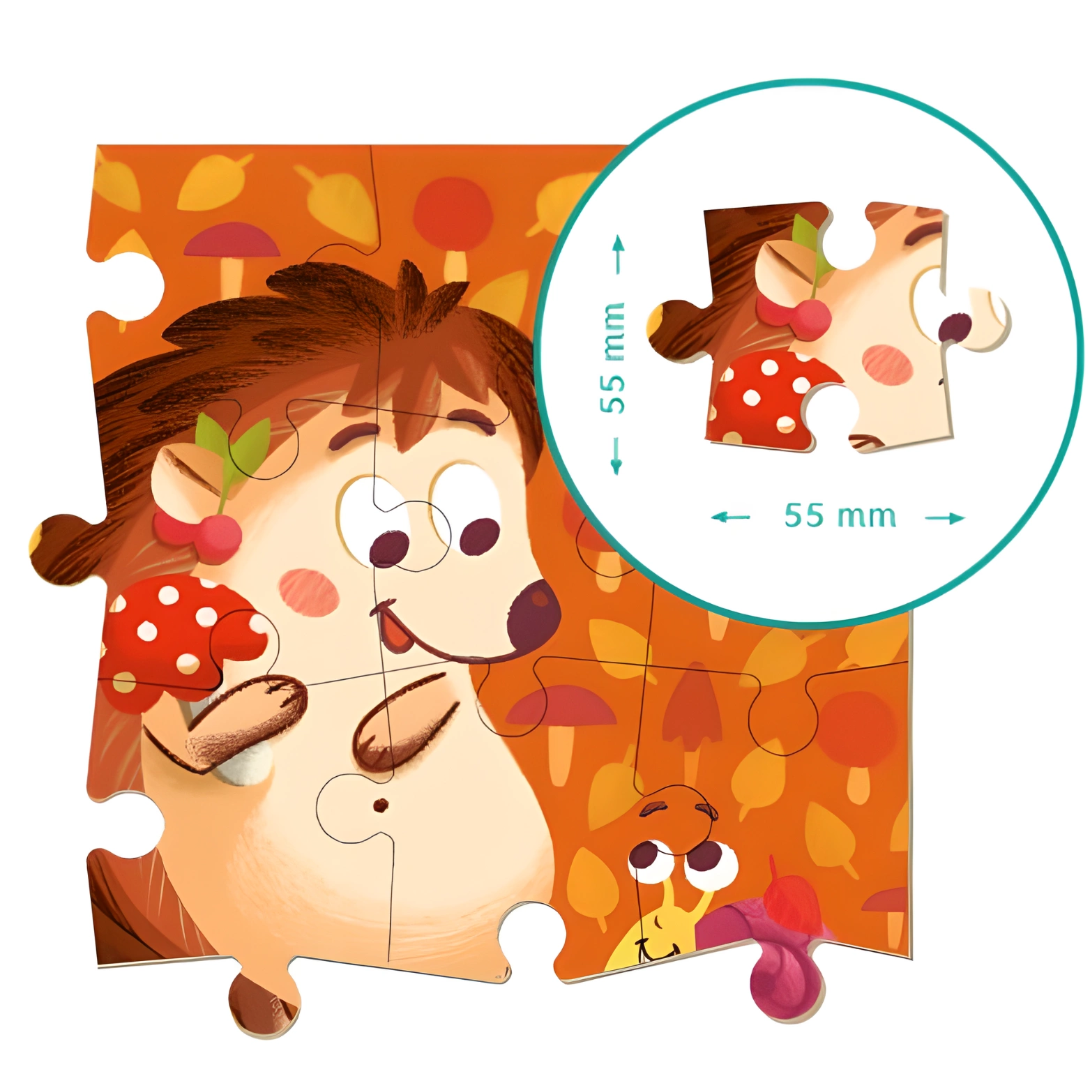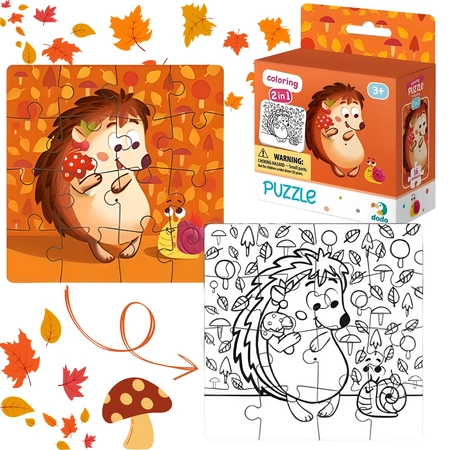 Podwójna radość z zabawy - jednej strony każdego puzzla znajduje się kolorowy obrazek "Jeżyka", gotowy do ułożenia. Ale to tylko początek! Z drugiej strony ukrywa się ta sama ilustracja, ale w wersji do kolorowania. Dziecko może więc cieszyć się procesem układania i kolorowania.