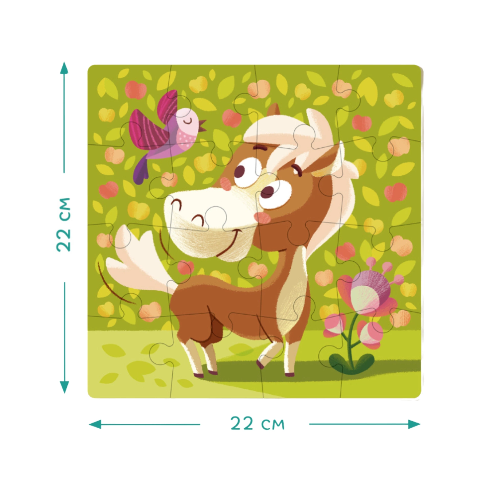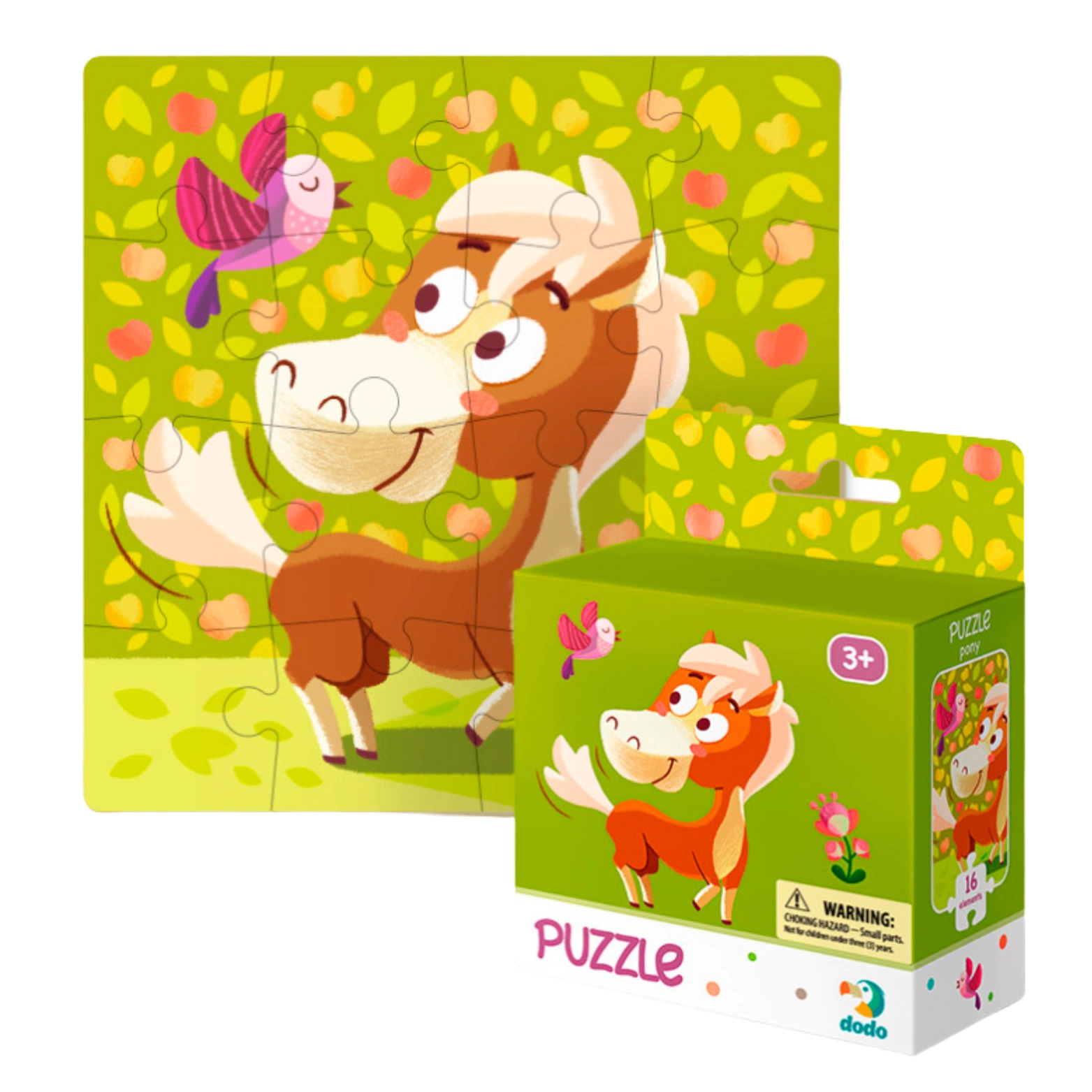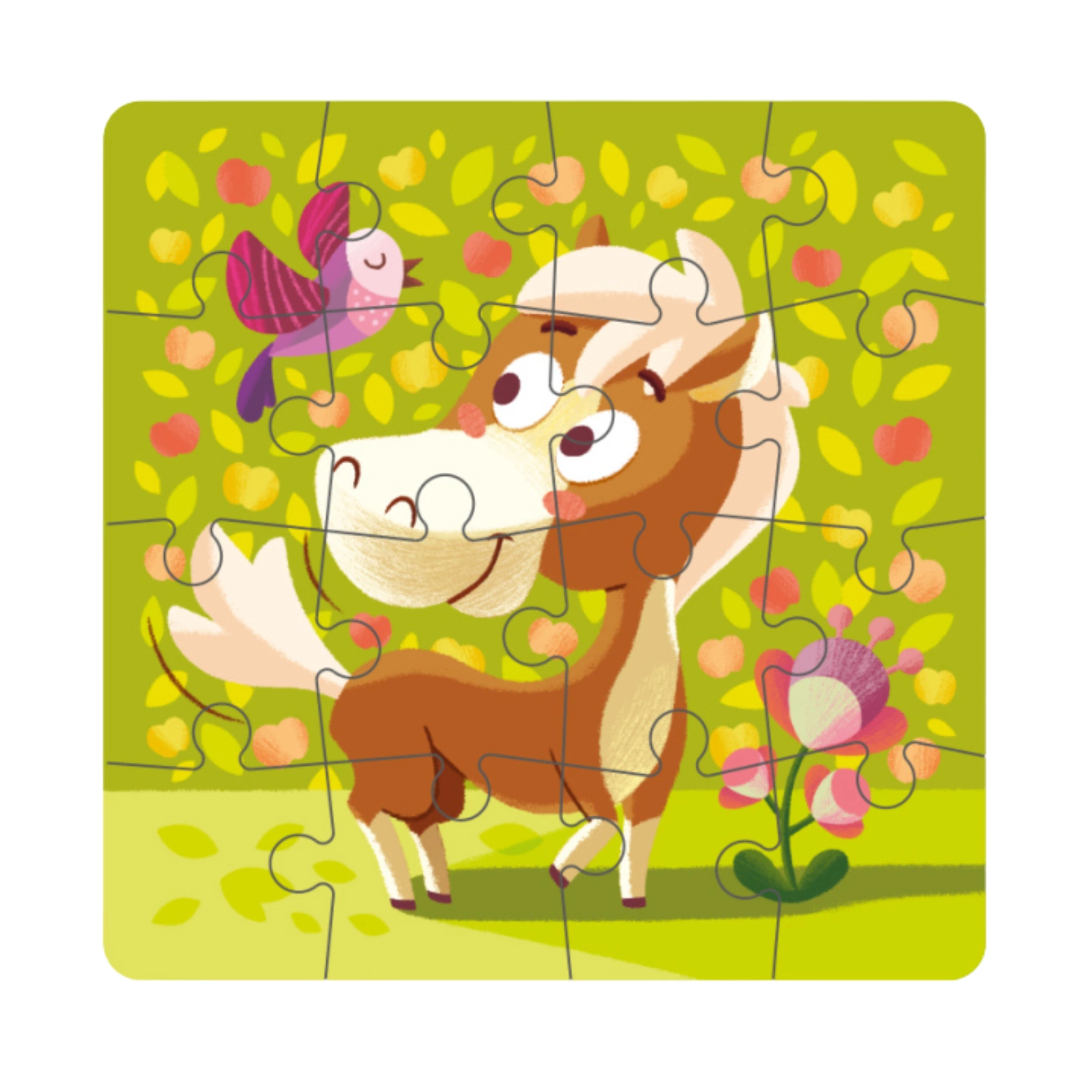 Po ułożeniu puzzli obrazek przedstawia uroczego konika, na kolorowym tle, wprowadzając wesoły nastrój.