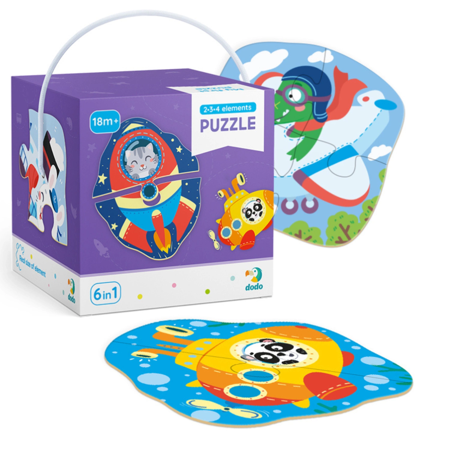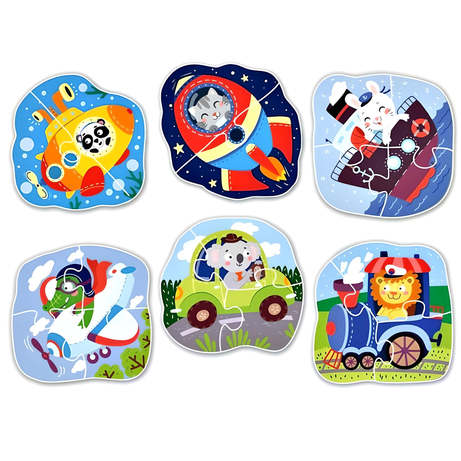 Sześć poziomów trudności: zestaw zawiera aż sześć układanek przedstawiających pociąg, samolot, rakietę, statek, samochód, każdy z nich kierowany przez urocze zwierzątka!