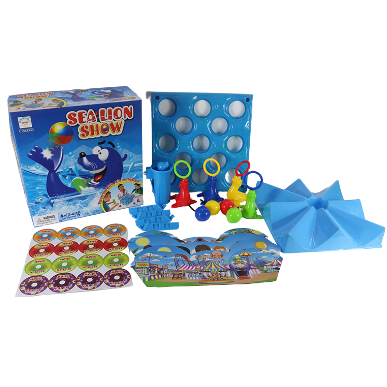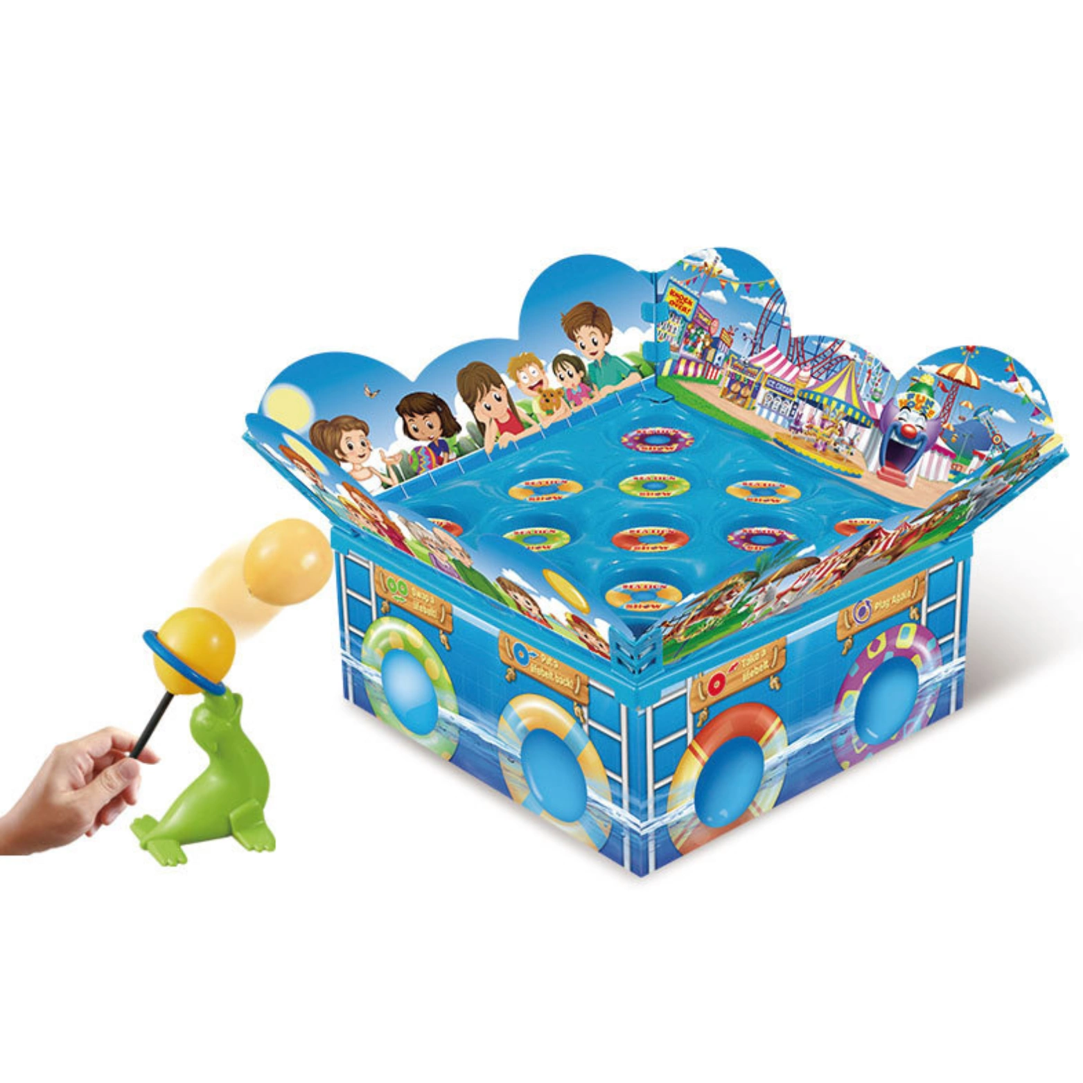 2. Do każdej obręczy należy umieścić specjalną piłeczkę za pomocą której kolejno każdy z graczy celuje w planszę - "kółka ratunkowe" na których widnieją różne ilości rybek.