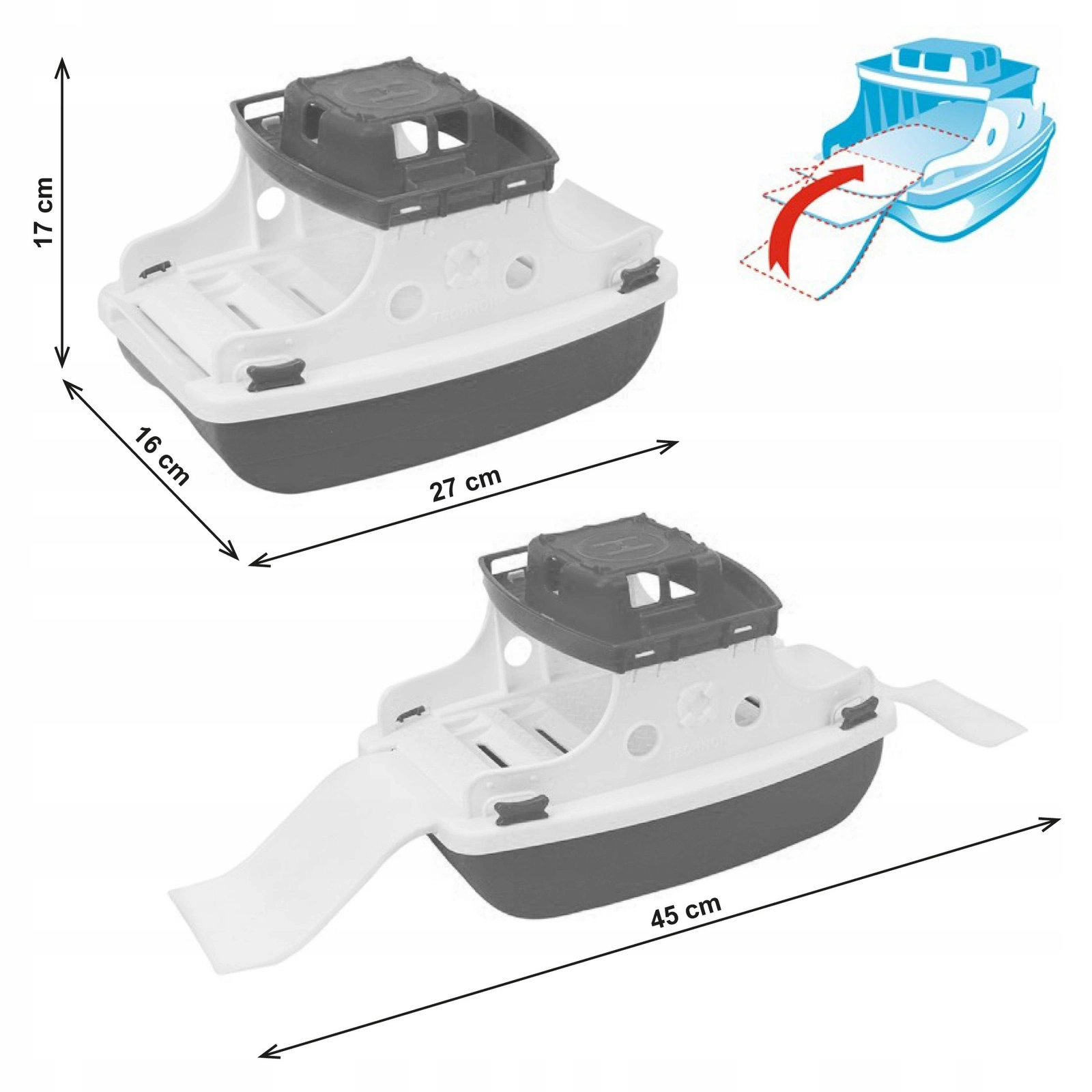 Zabawka "Prom TechnoK" z figurkami na pokładzie z pewnością przypadnie do gustu pociechom. Prom to niesamowite połączenie piękna i funkcjonalności. Jego konstrukcja pozwala dobrze pływać i przewozić ulubione zabawki. Prom wyposażony jest w dwie drabinki, które są ukryte w kadłubie i nie przeszkadzają w ruchu. W górnej części znajduje się sterówka kapitańska, pokład dla pasażerów oraz platforma dla helikoptera.