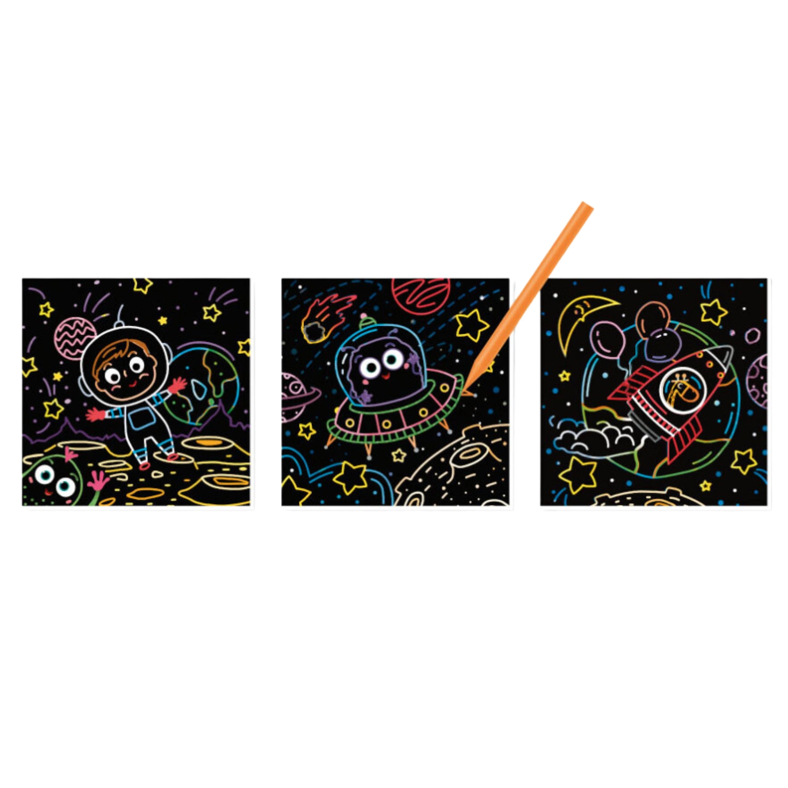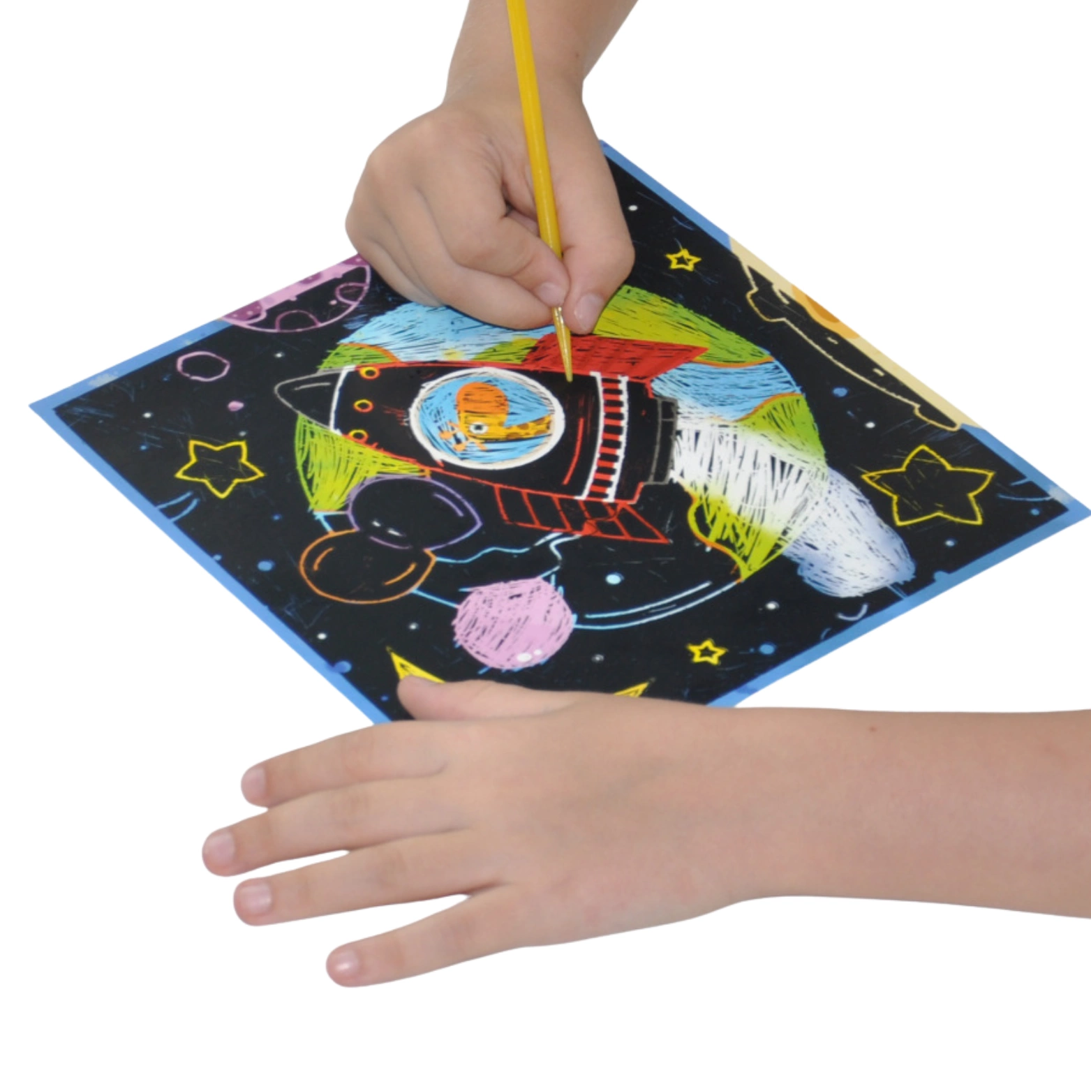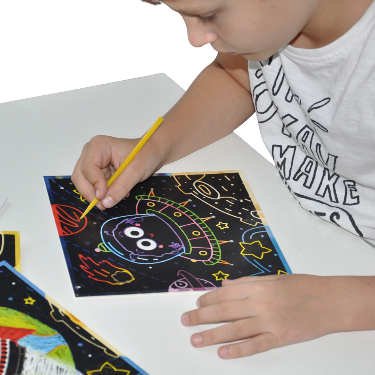 Wykorzystując metodę scratch, dzieci mają okazję odkrywać kosmiczne obrazy ukryte pod czarną powierzchnią.