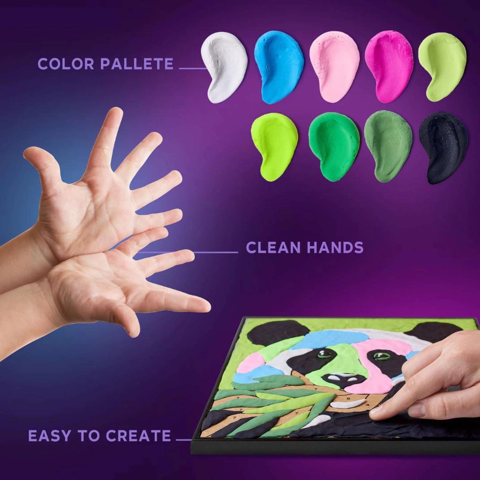 Kształtowanie, Mieszanie, Przyklejanie: proces tworzenia jest prosty i zabawny! Kształtuj, mieszaj i przyklejaj specjalną masę do płótna, które już czeka w opakowaniu. To interaktywne podejście pozwala na pełne zaangażowanie w proces tworzenia.