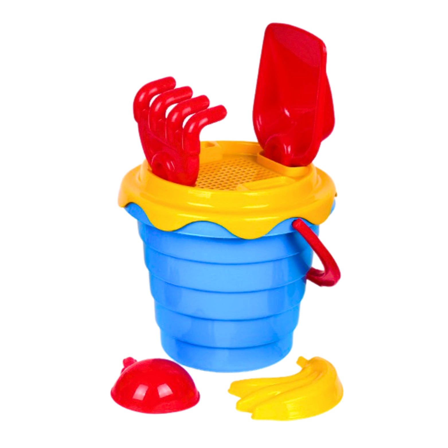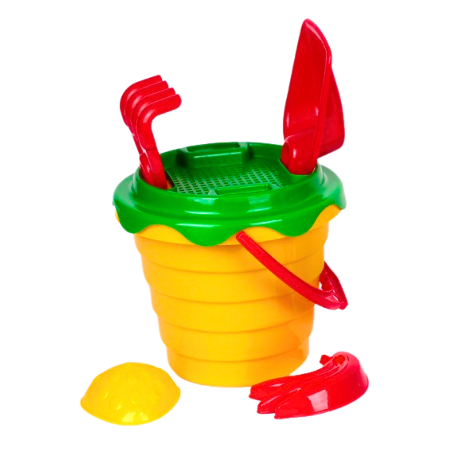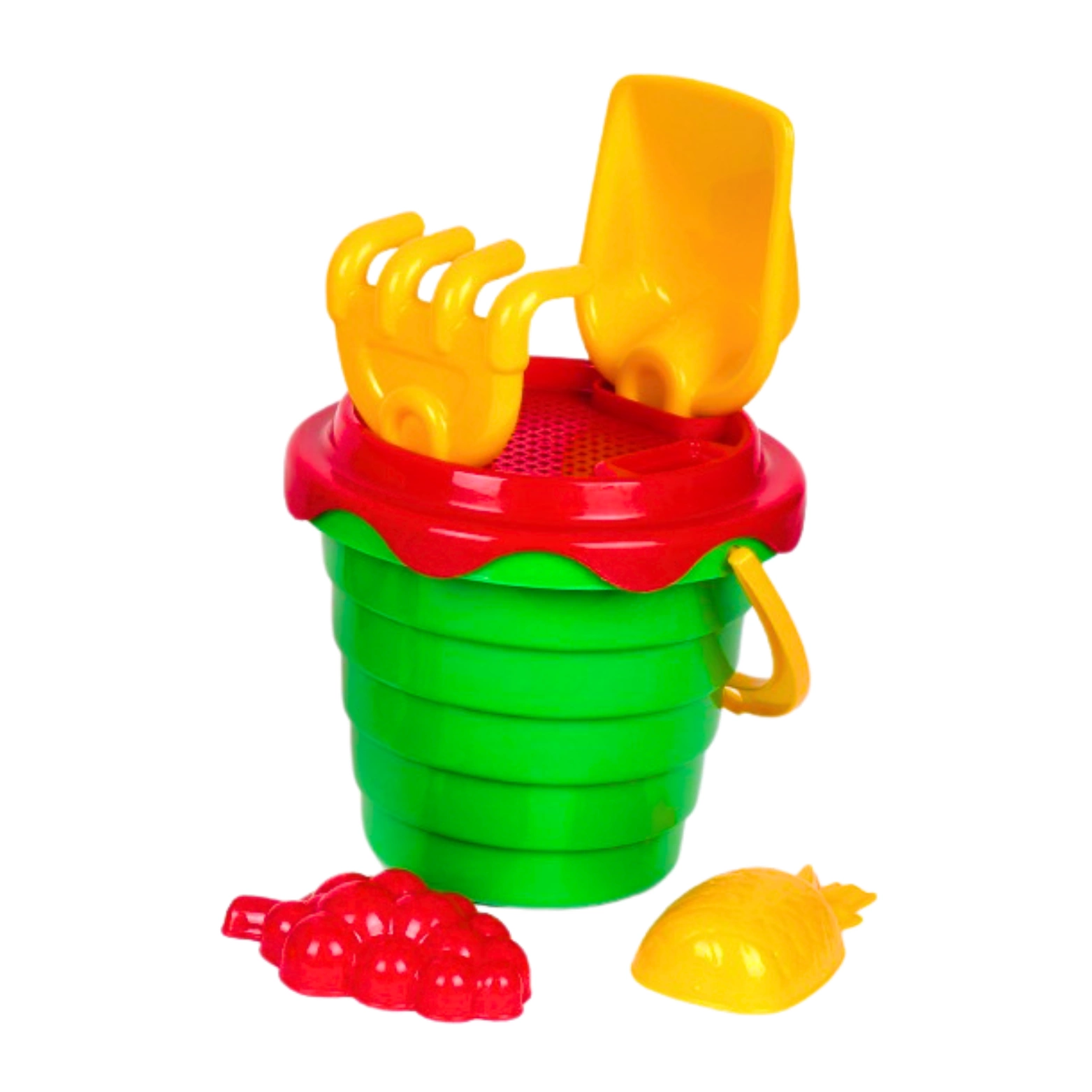 Zabawki wykonane z najwyższej jakości tworzyw, przetrwają wszelkie warunki oraz zapewnią bezpieczeństwo w użytkowaniu. W zestawie znajduje się wiaderko z wytłaczanym wzorem, łopatka, grabki, foremki (2) i sitko, dzięki któremu możemy zabezpieczyć elementy przenoszone w wiaderku. Kontrastujące kolory przyciągają wzrok, a zaokrąglone kształty sprawiają, że zabawka jest odpowiednia dla każdego.