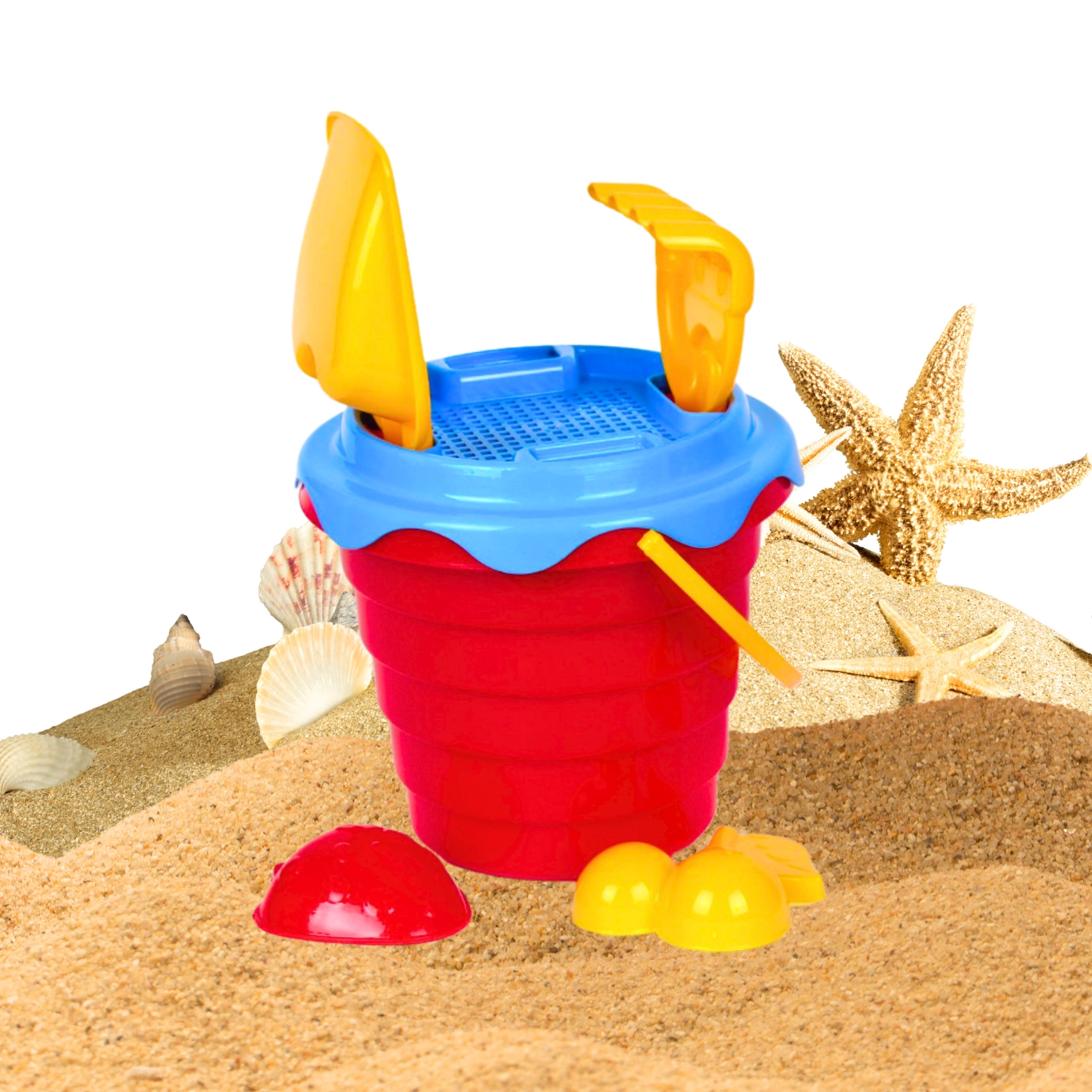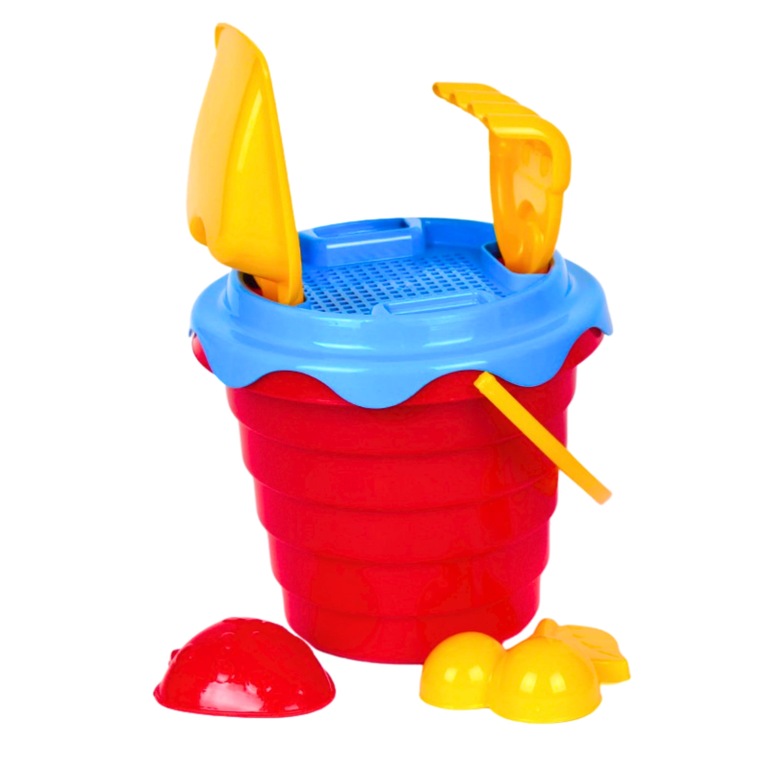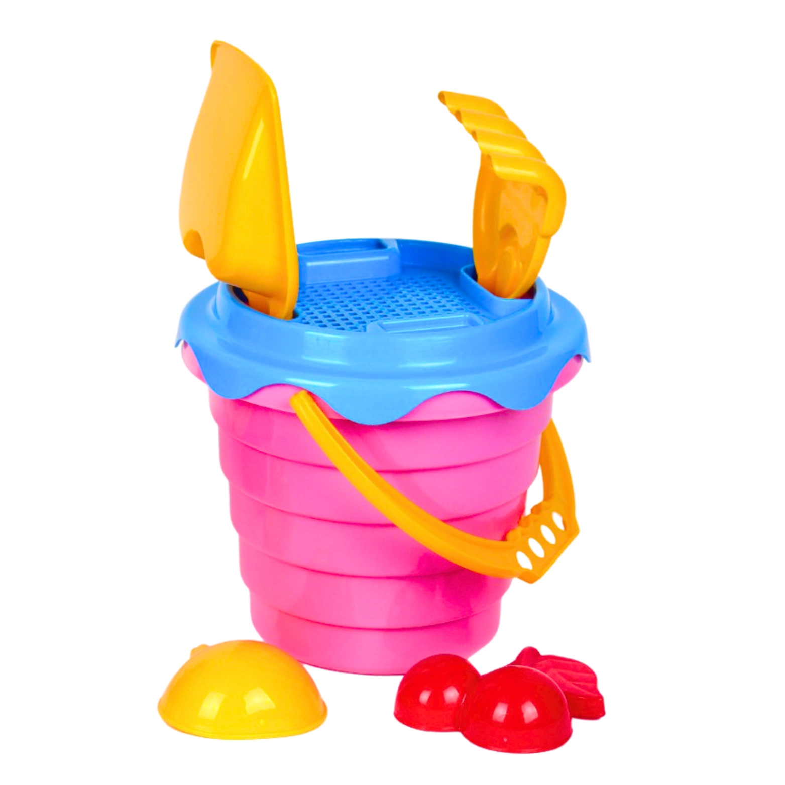 Zabawki wykonane z najwyższej jakości tworzyw, przetrwają wszelkie warunki oraz zapewnią bezpieczeństwo w użytkowaniu. W zestawie znajduje się wiaderko z wytłaczanym wzorem, łopatka, grabki, foremki (2) i sitko, dzięki któremu możemy zabezpieczyć elementy przenoszone w wiaderku. Kontrastujące kolory przyciągają wzrok, a zaokrąglone kształty sprawiają, że zabawka jest odpowiednia dla każdego.