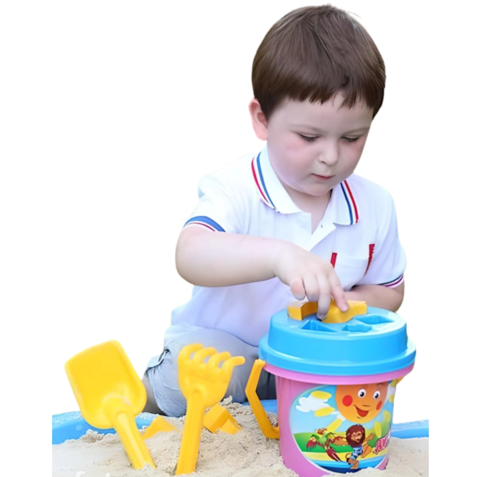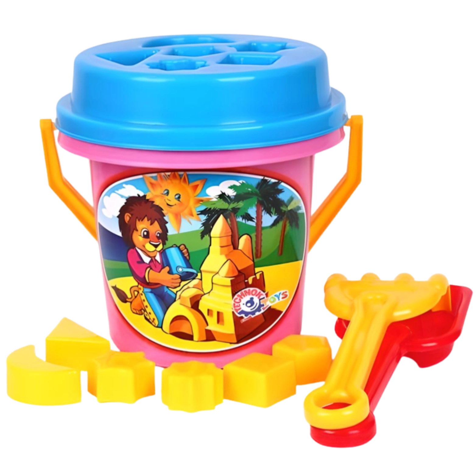 W skład zestawu wchodzi kolorowe wiaderko, które pełni funkcję zarówno pojemnika na piasek. Dzięki pokrywce wiaderka - sorter, której kształt odpowiada kształtom klocków, maluchy mogą ćwiczyć rozpoznawanie kształtów. Klocki w zestawie idealnie pasują do sortera, co stanowi dodatkowy element edukacyjny.