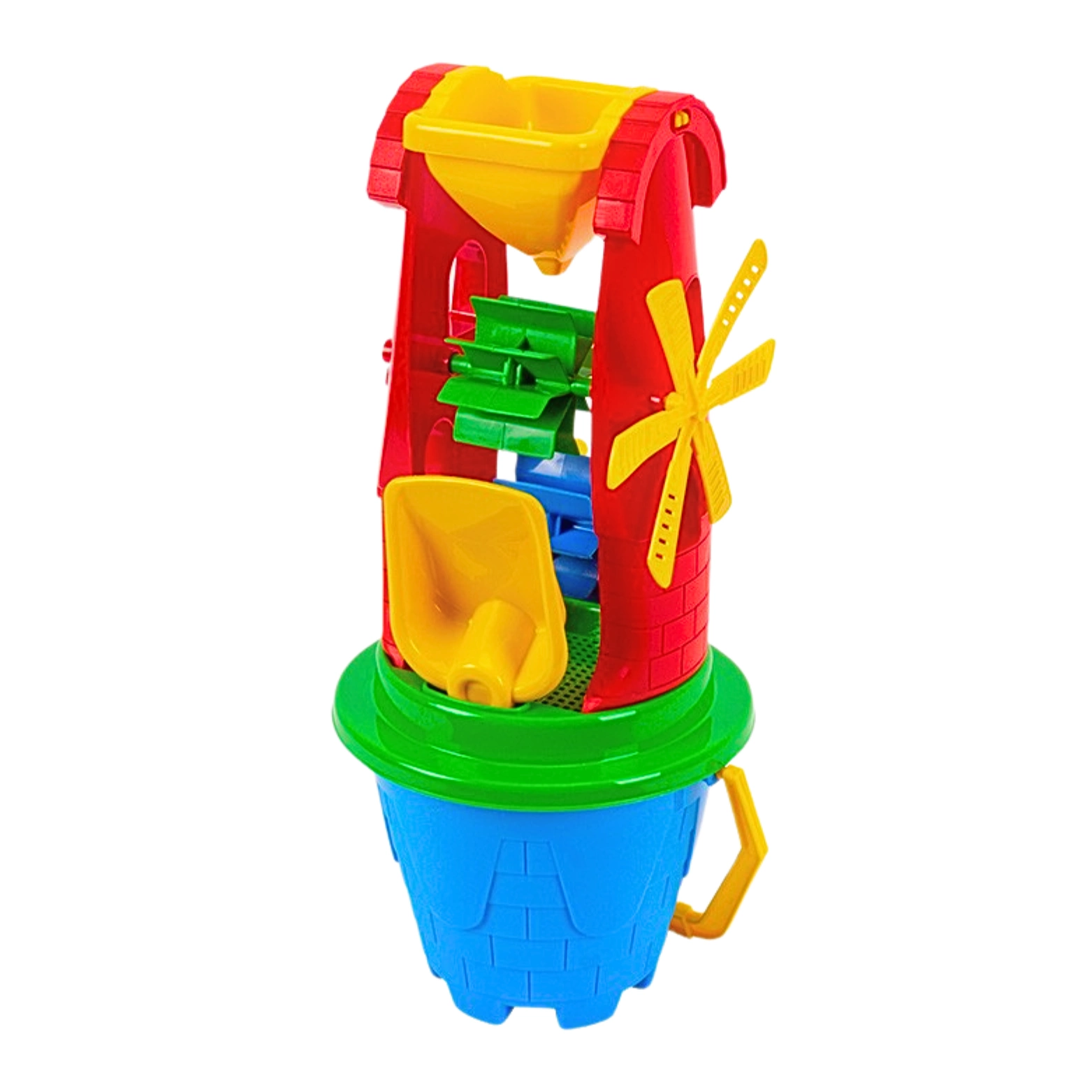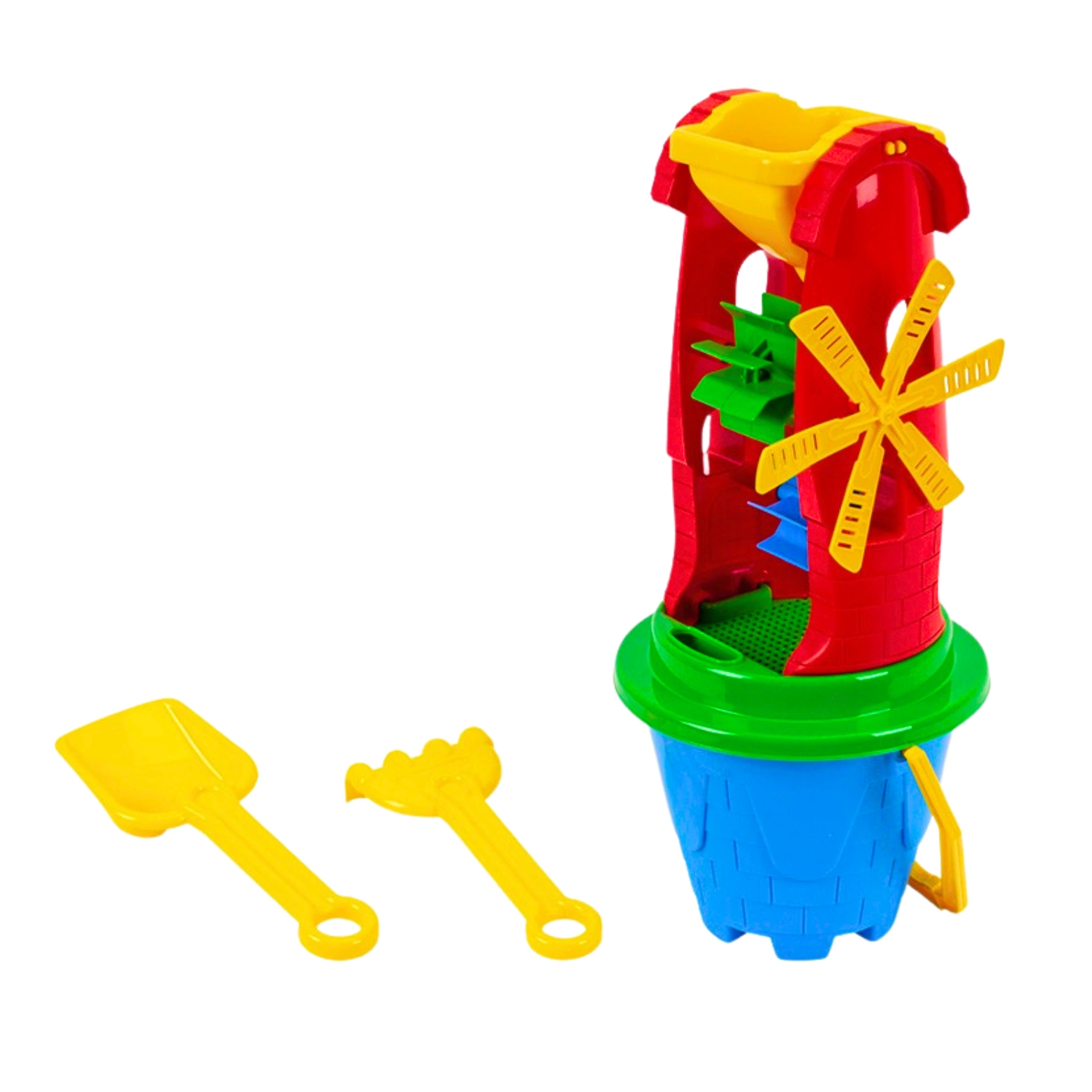 W tym zestawie poza samym młynem, znajdują się również: łopatka i grabki, wiaderko z wytłoczonym wzorem zamku.