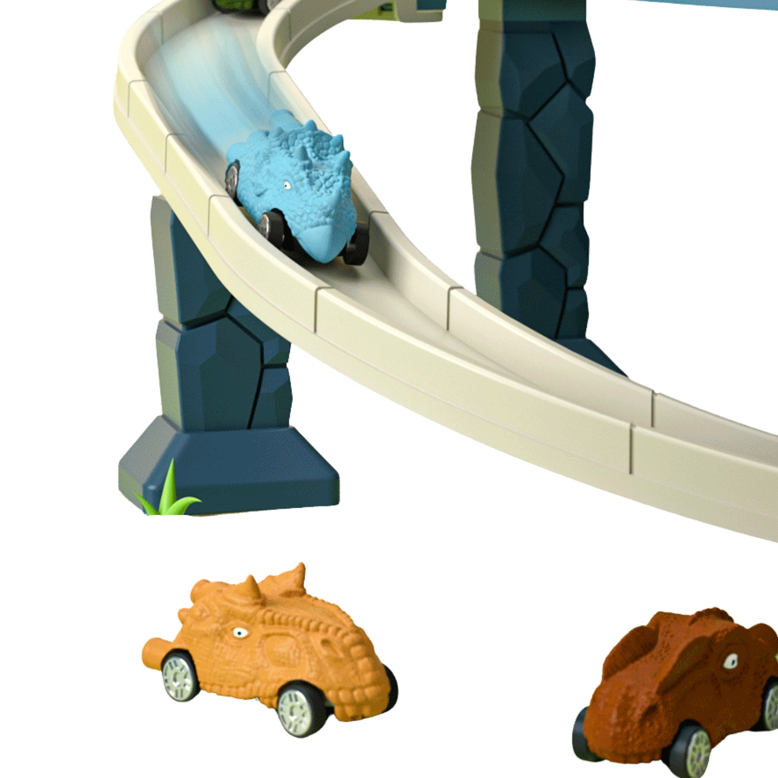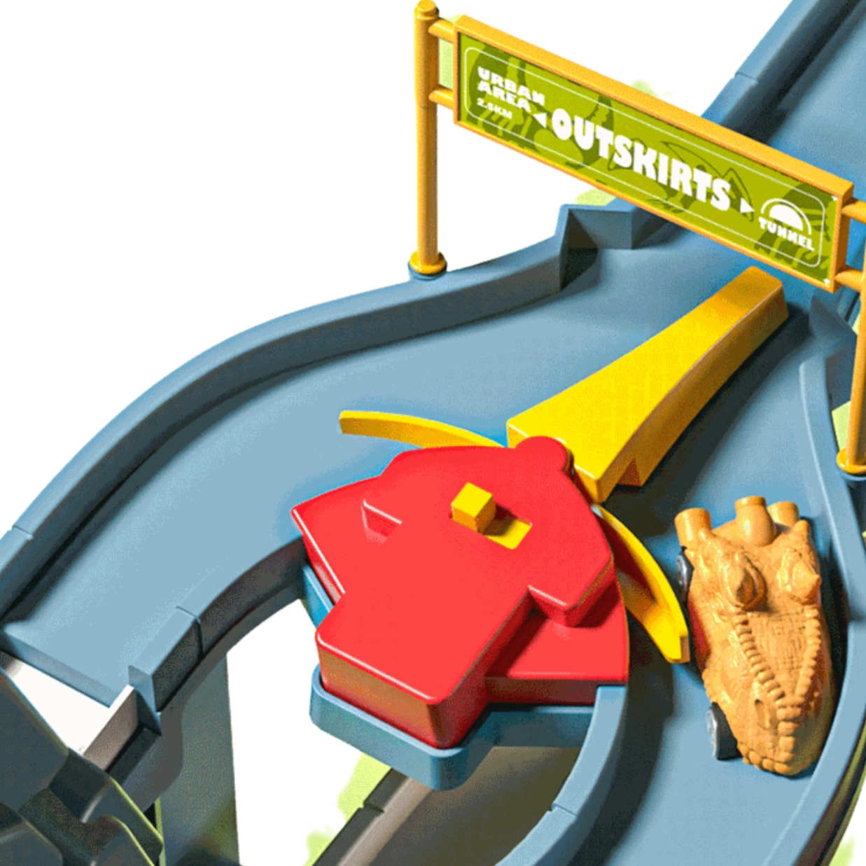 Zestaw ten to nie tylko tor wyścigowy, to całe miasto stworzone z myślą o dinozaurach! Zjazdy i podjazdy oferują niekończące się możliwości ekscytujących pościgów. Fantazyjne elementy, jakie się tu znajdują, tworzą niesamowity klimat, dzięki któremu zabawa będzie jeszcze bardziej atrakcyjna i ekscytująca.