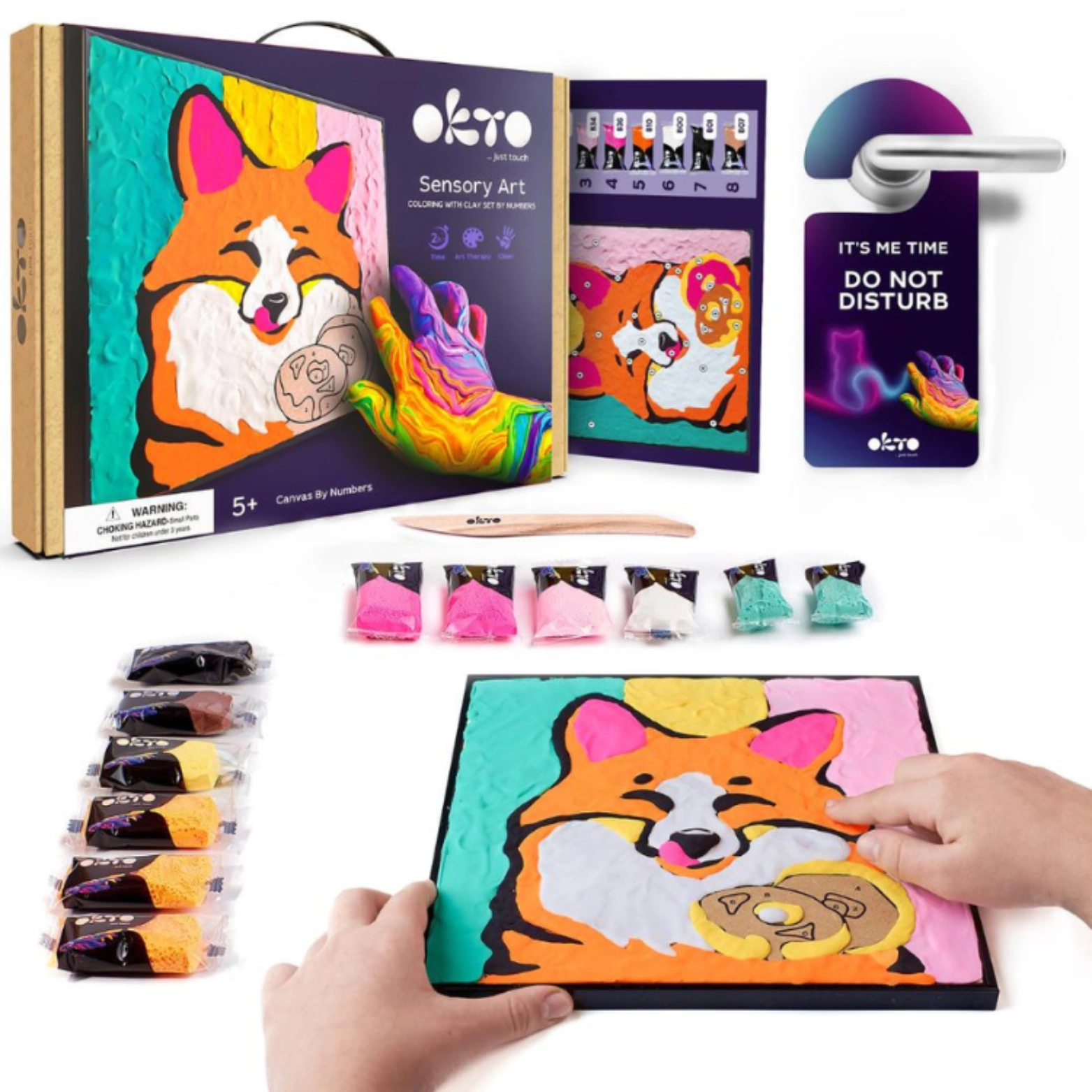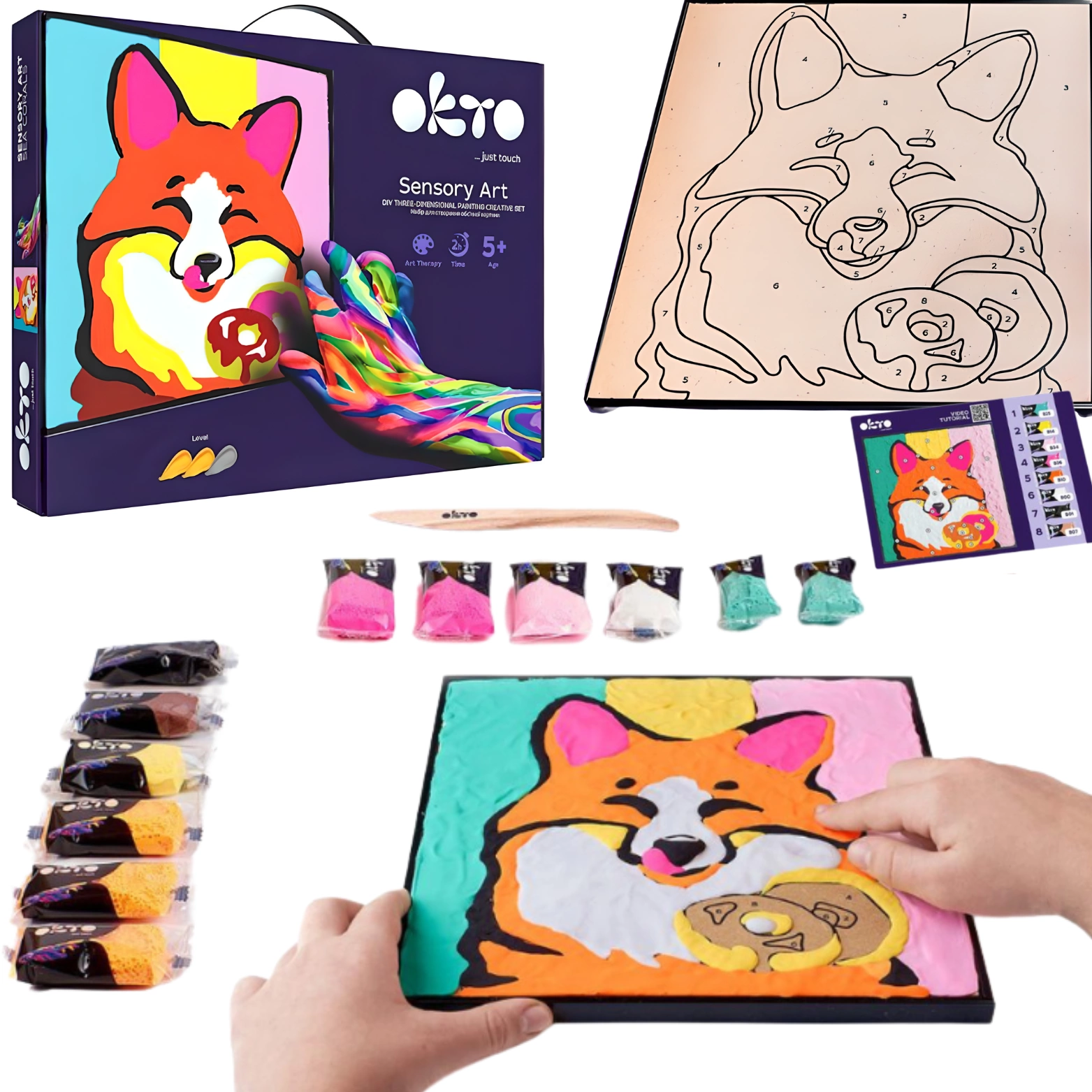 Kształtowanie, Mieszanie, Przyklejanie: proces tworzenia jest prosty i zabawny! Kształtuj, mieszaj i przyklejaj specjalną masę do płótna, które już czeka w opakowaniu. To interaktywne podejście pozwala na pełne zaangażowanie w proces tworzenia.