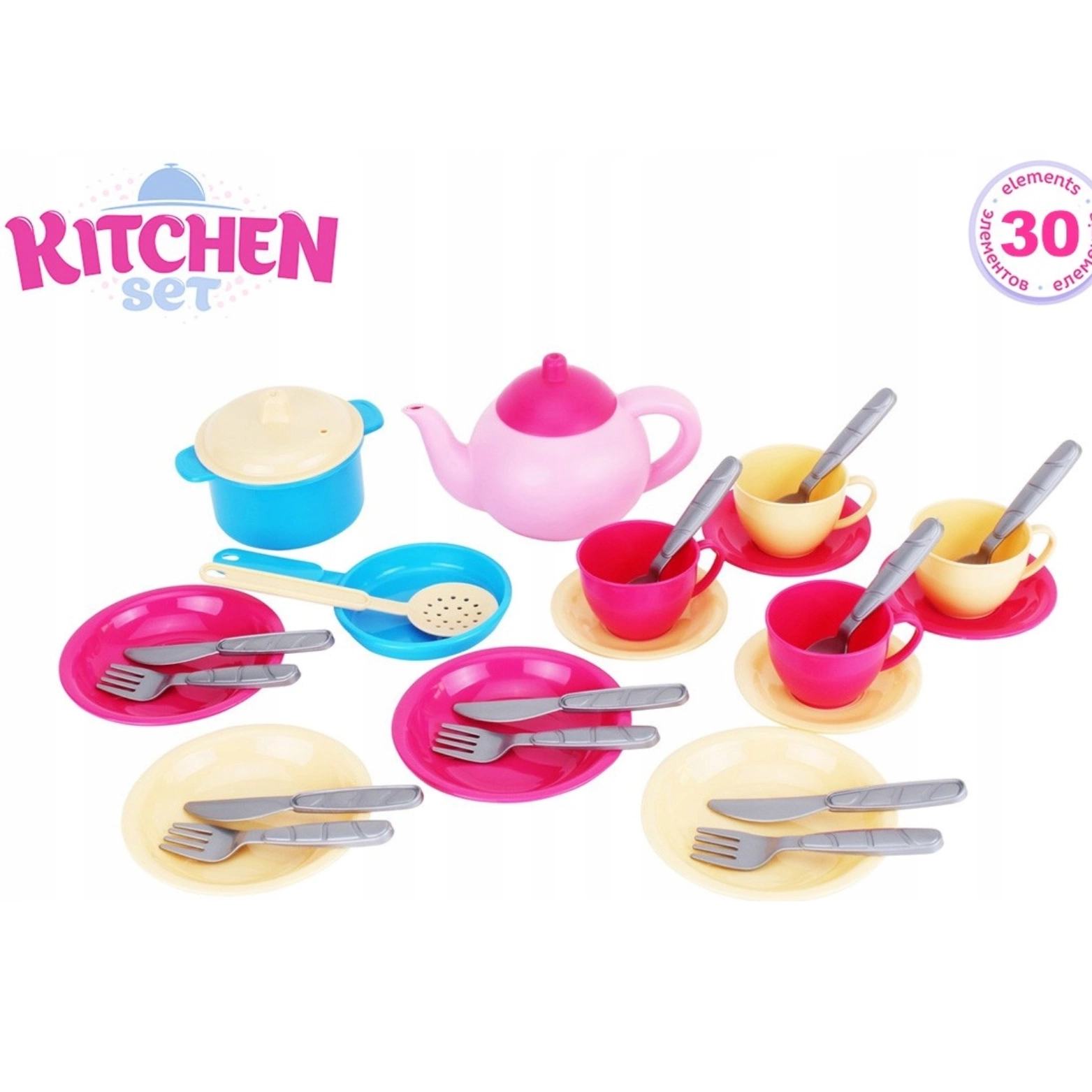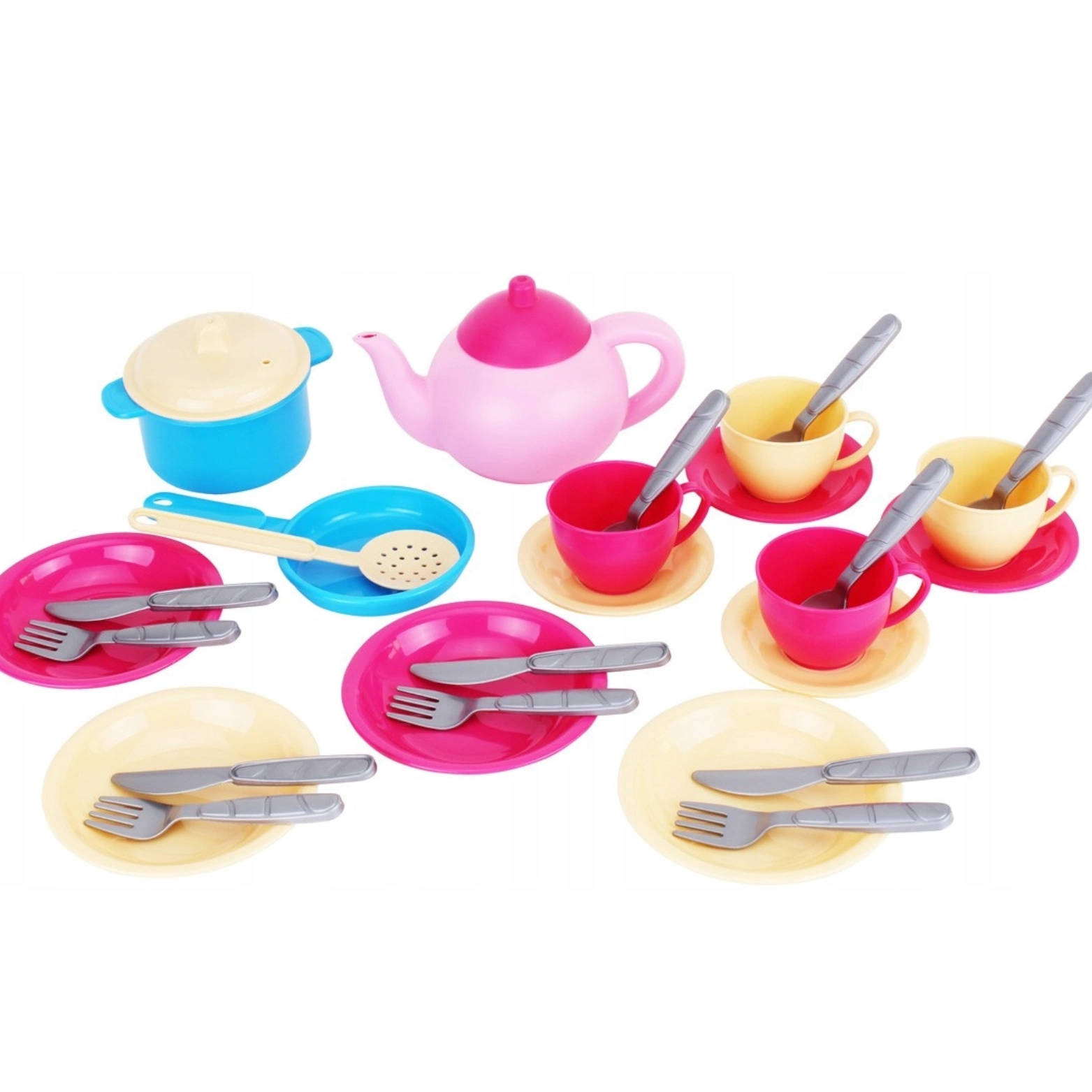 Masz w domu mała kucharkę lub małą panią domu, która lubi ugaszczać swoje koleżanki? ? Jeśli tak, to przedstawiamy zestaw kuchenny, dzięki któremu będzie mogła według siebie przywitać gości. Kawa, herbata lub może obiad? Teraz ona rządzi swoją kuchnią i może bawić się ile chce! Komplet zawiera m.in talerze, garnki, sztućce, to co jest najbardziej potrzebne w każdej kuchni, nawet u twojego dziecka.