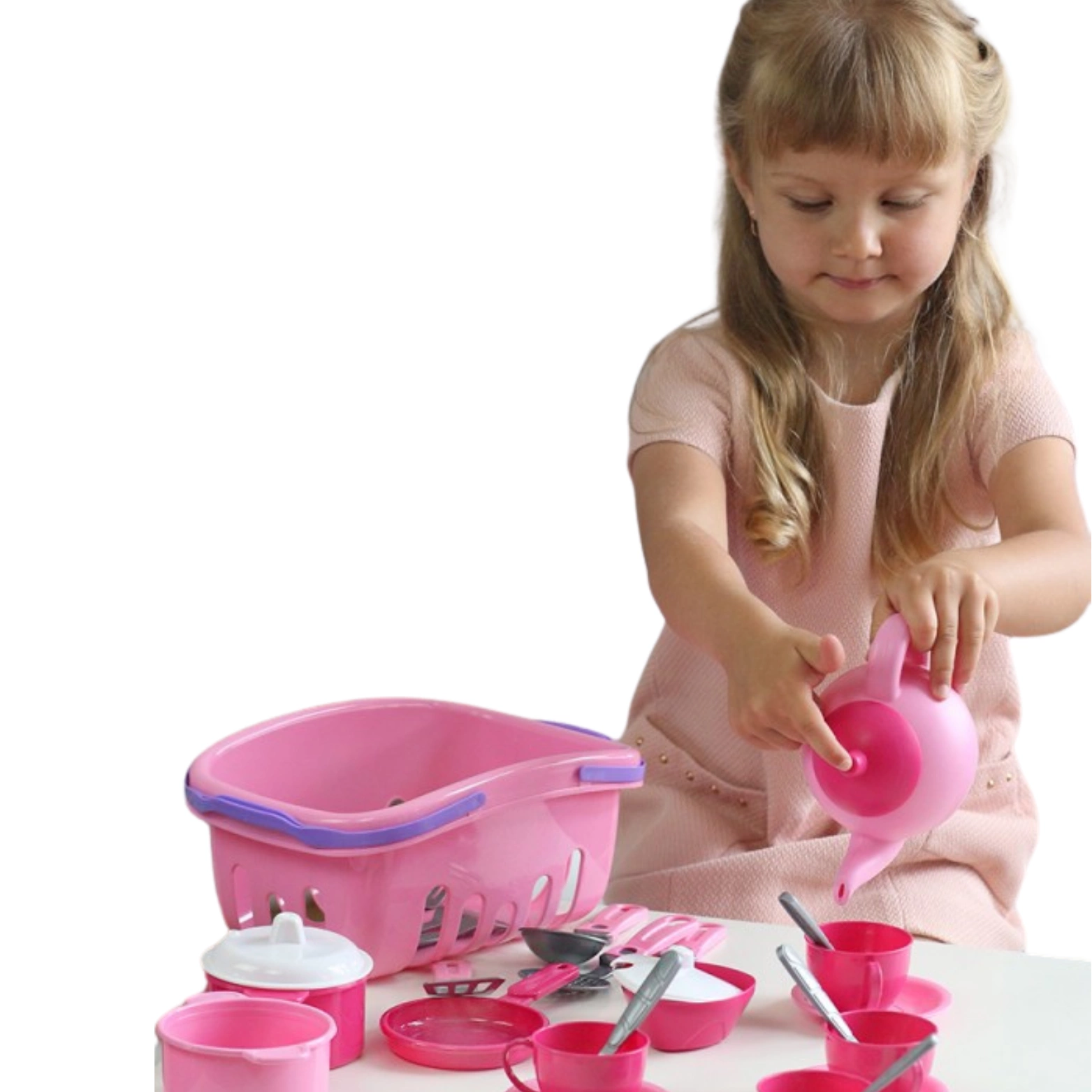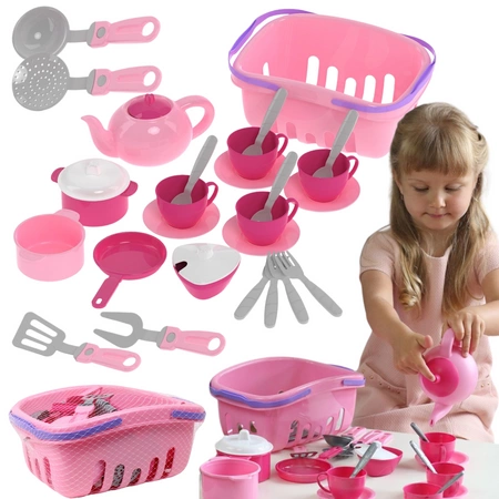 W skład zestawu wchodzą realistycznie wykonane przybory kuchenne, które spotyka się na co dzień w domu. Garnki, patelnia, filiżanki, łyżki i wiele innych pozwalają maluchowi na odtwarzanie codziennych czynności, rozwijając jednocześnie zdolności społeczne i dbałość o porządek.