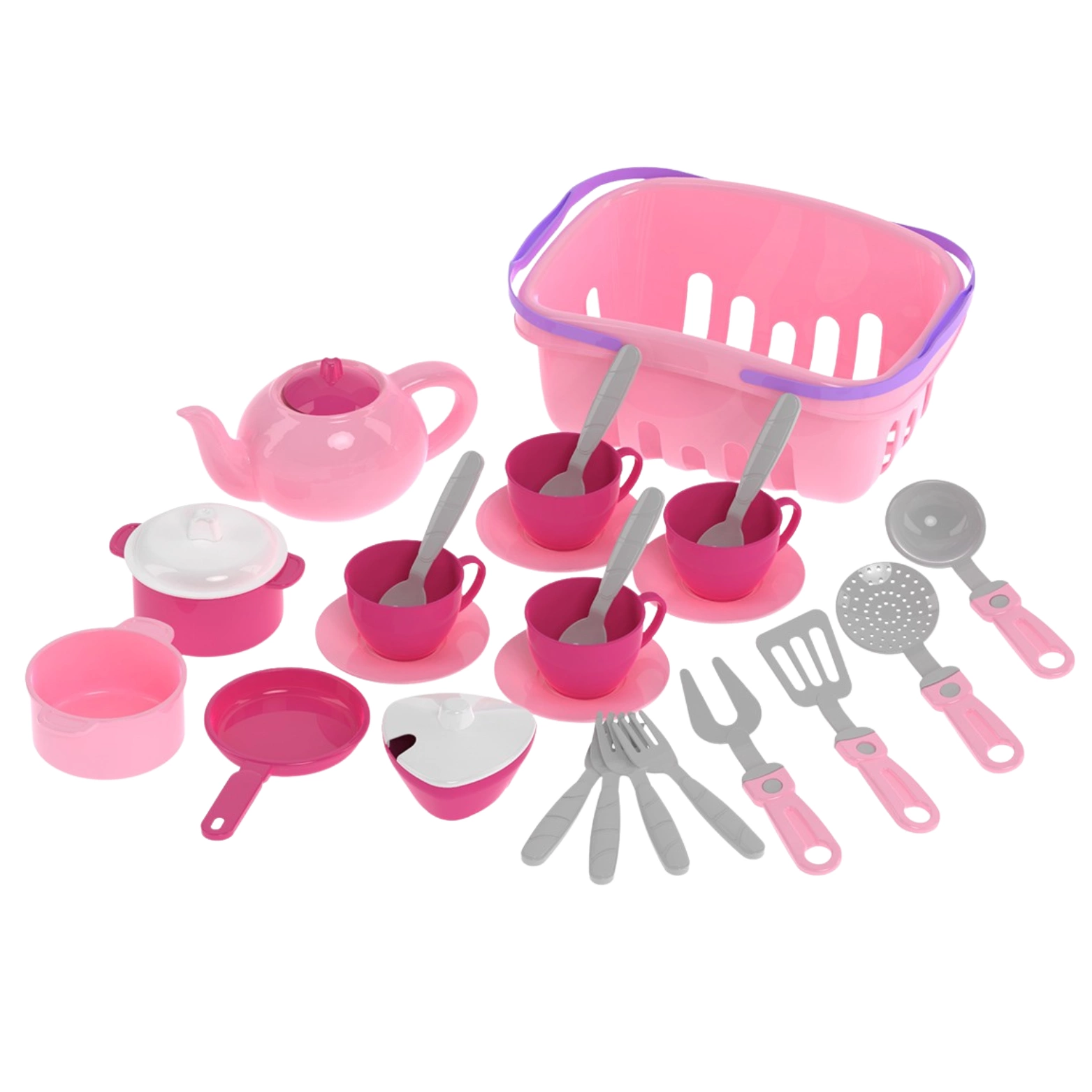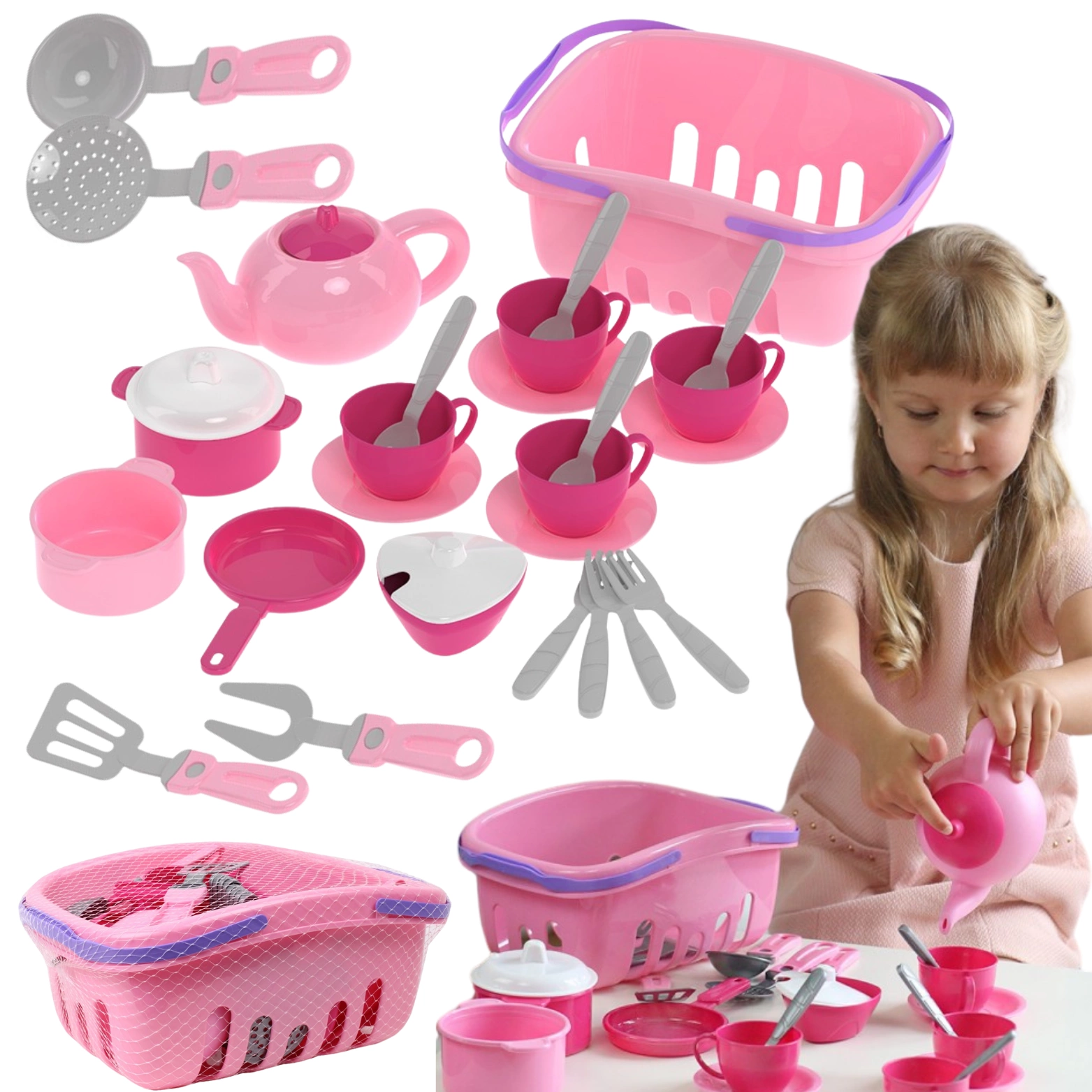 Zestaw pomaga dzieciom w nauce liczenia, rozpoznawania kolorów i kształtów oraz rozwija zmysł estetyki. Zabawa w gotowanie i podawanie posiłków staje się fascynującym sposobem na naukę. Dzięki koszykowi na zakupy dzieci mogą swobodnie przenosić wszystkie przybory kuchenne, a także wcielić się w rolę klienta sklepu i kupować różnorodne produkty.