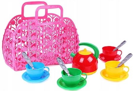 Nasz kolorowy i herbaciany zestaw zawiera czajnik oraz komplet filiżanek z łyżeczkami. Zabawka może być wspaniałym prezentem na urodziny. Zestaw czeka na mała damę, aby mogła przygotować popołudniową herbatę lub kawę dla gości lub rodziny. Dzieci nie tylko będą fantastycznie się bawić, lecz także uczyć wykonywania domowych obowiązków pobudzając swoją wyobraźnię i ćwicząc koordynację ruchową.