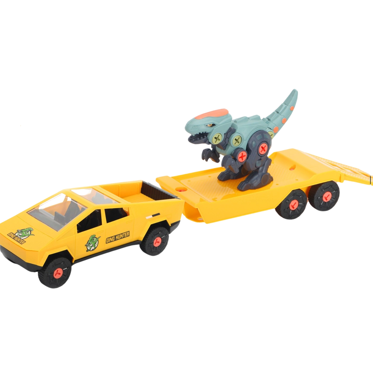 Samochód z przesuwaną przyczepą to główny element zestawu. Wyposażony w ruchome części, samochód oferuje pełen zakres zabawy. Koła pojazdu można samodzielnie wkręcać i wykręcać, co rozwija zdolności motoryczne dziecka. Przyczepa zawiera strasznego dinozaura! Dinozaura również można montować i demontować samodzielnie.